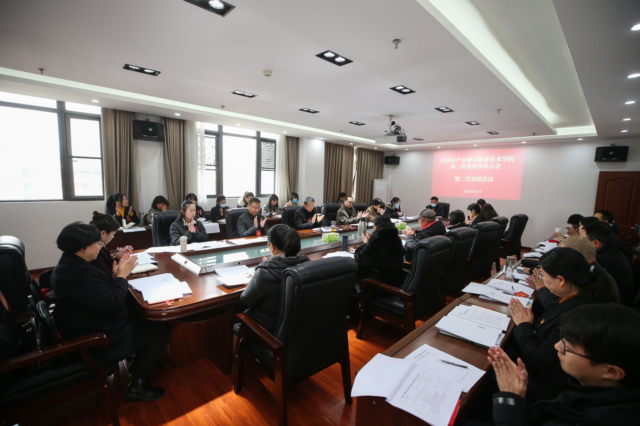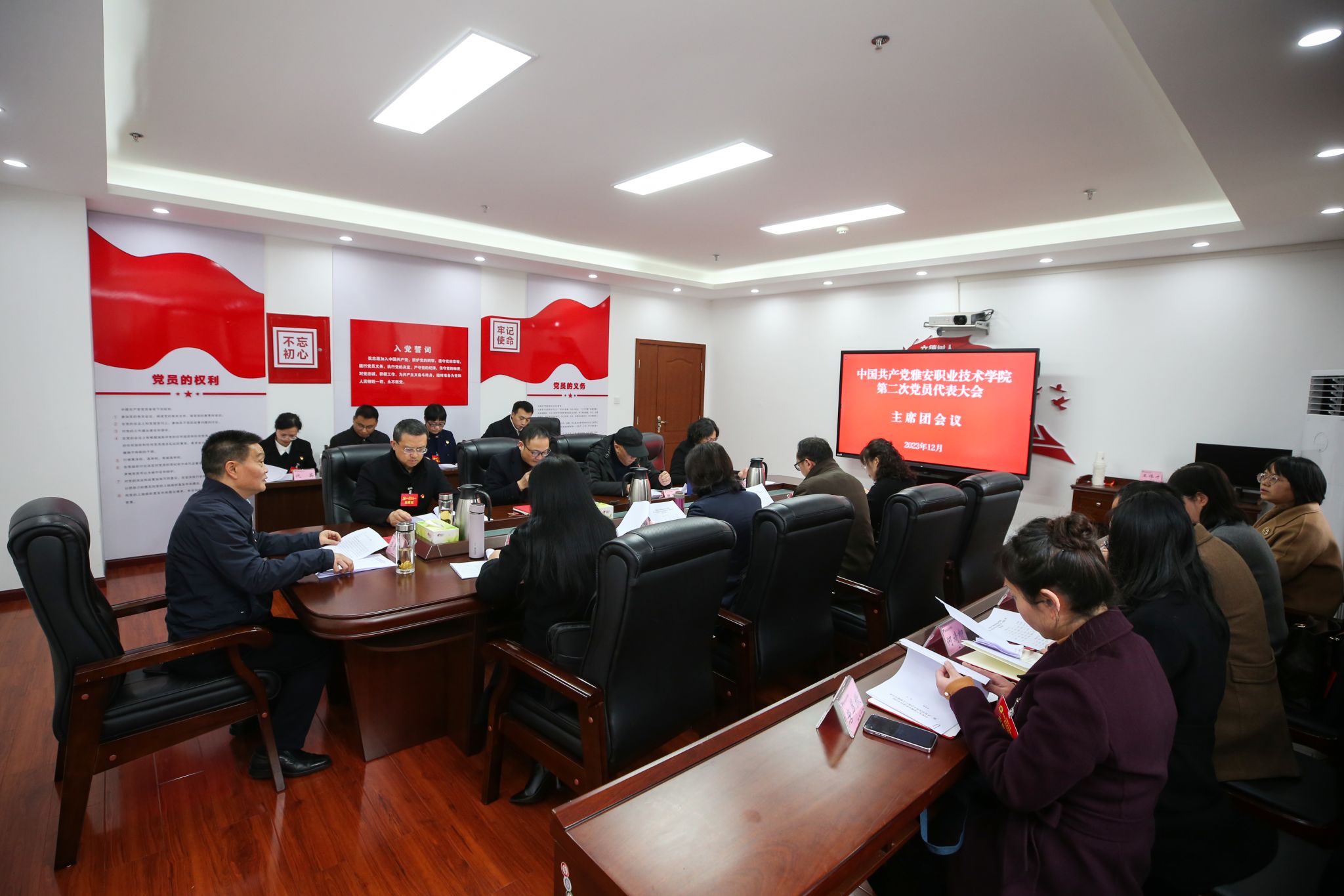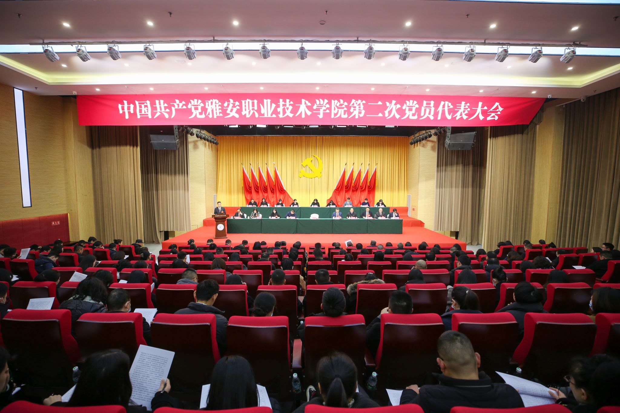 12月28日上午,中国共产党beat365在线唯一官网第二次党员代表大会在经开区校区聚雅厅开幕。会场外,“凝心聚力谋发展 奋辑笃行谱新篇——我们这五年”成就展整齐排列。会场内,气氛庄重热烈,主席台上金色的党徽与十面鲜艳的红旗相映生辉,会场后方悬挂的“踔厉奋发 乘势而上 为建设特色鲜明高水平高职院校而团结奋斗”的横幅催人奋进。