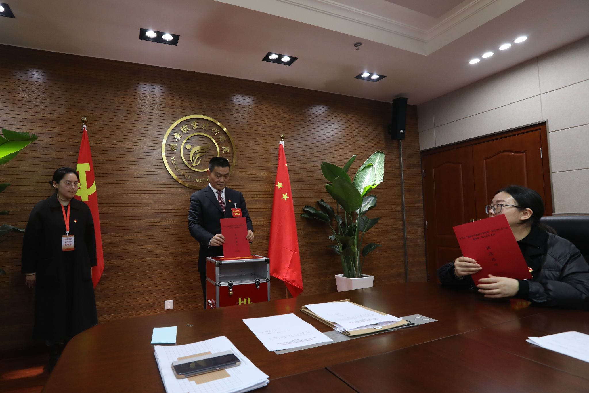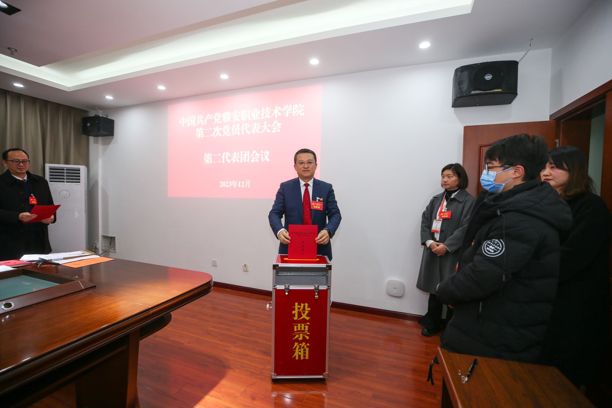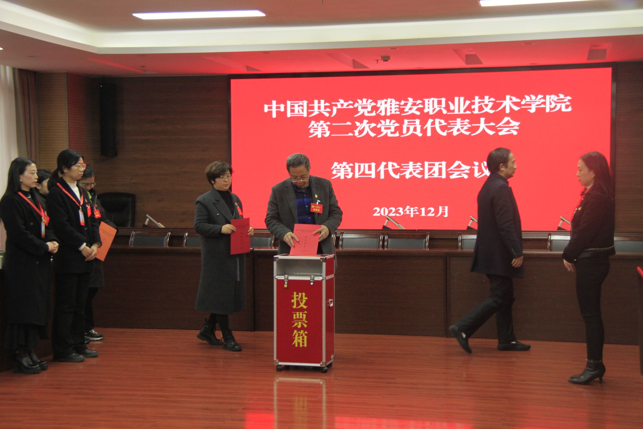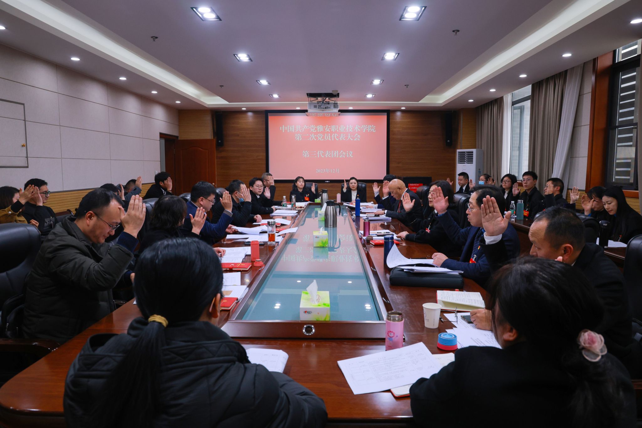 12月28日上午,中国共产党beat365在线唯一官网第二次党员代表大会在经开区校区聚雅厅开幕。会场外,“凝心聚力谋发展 奋辑笃行谱新篇——我们这五年”成就展整齐排列。会场内,气氛庄重热烈,主席台上金色的党徽与十面鲜艳的红旗相映生辉,会场后方悬挂的“踔厉奋发 乘势而上 为建设特色鲜明高水平高职院校而团结奋斗”的横幅催人奋进。