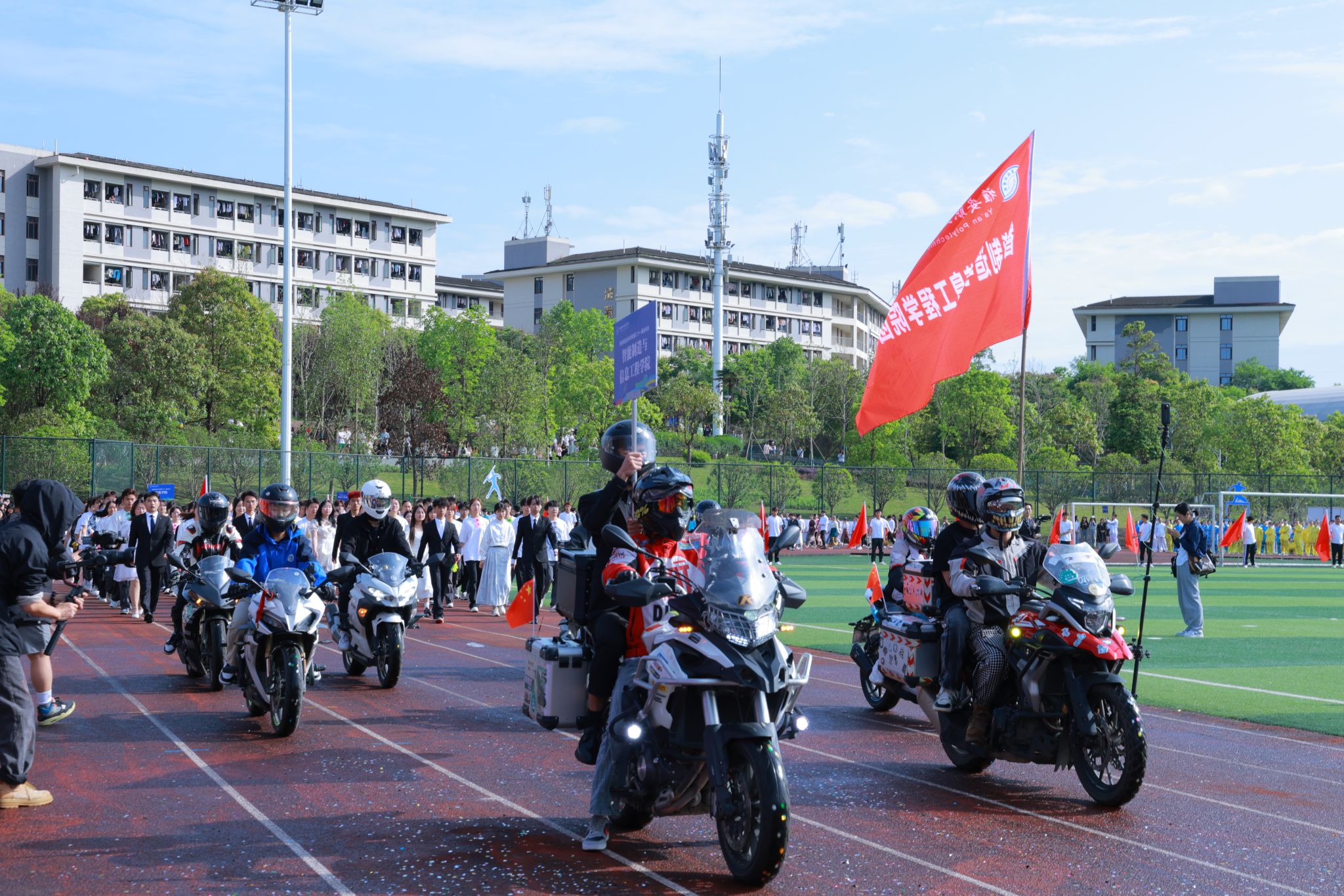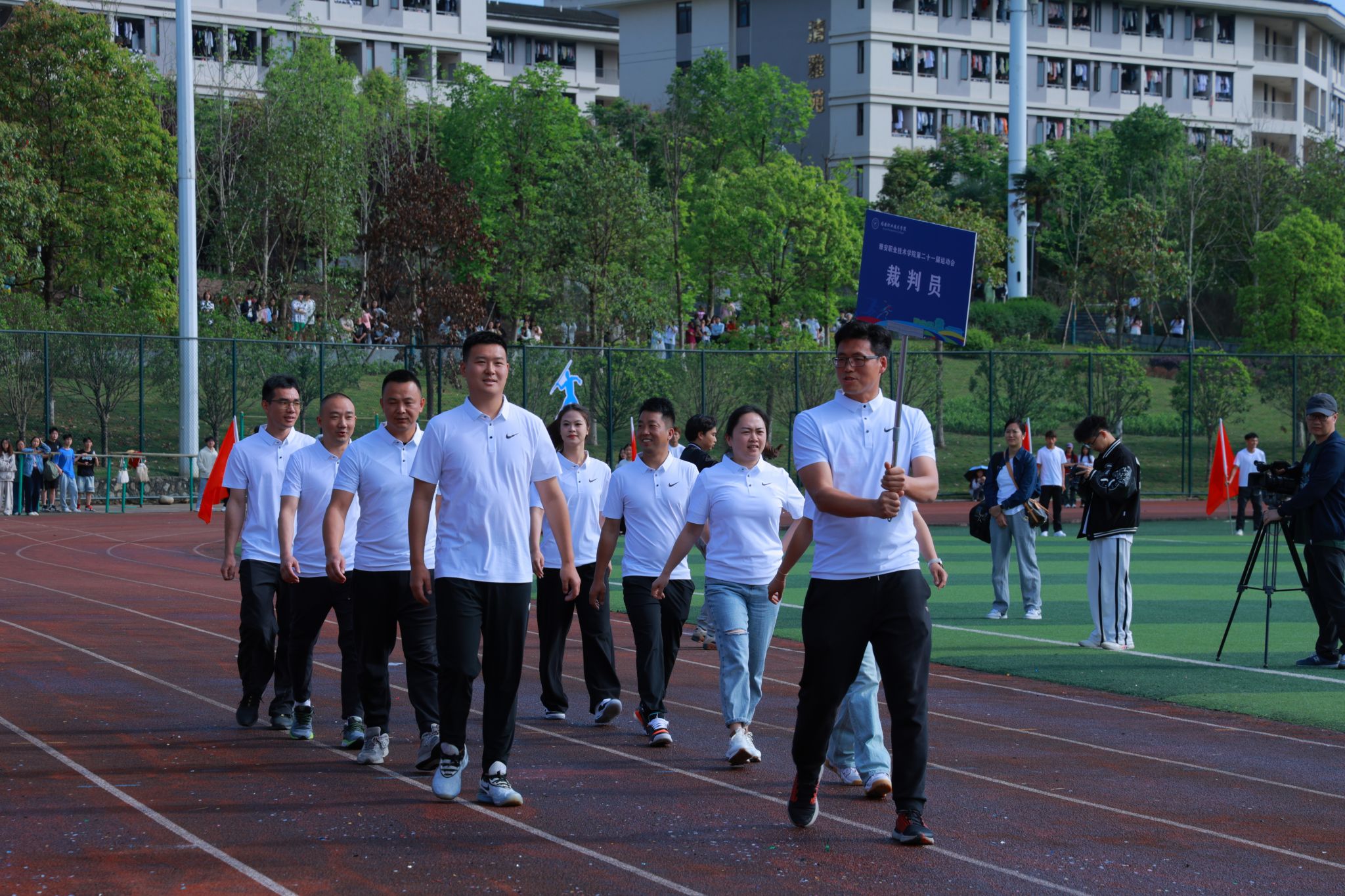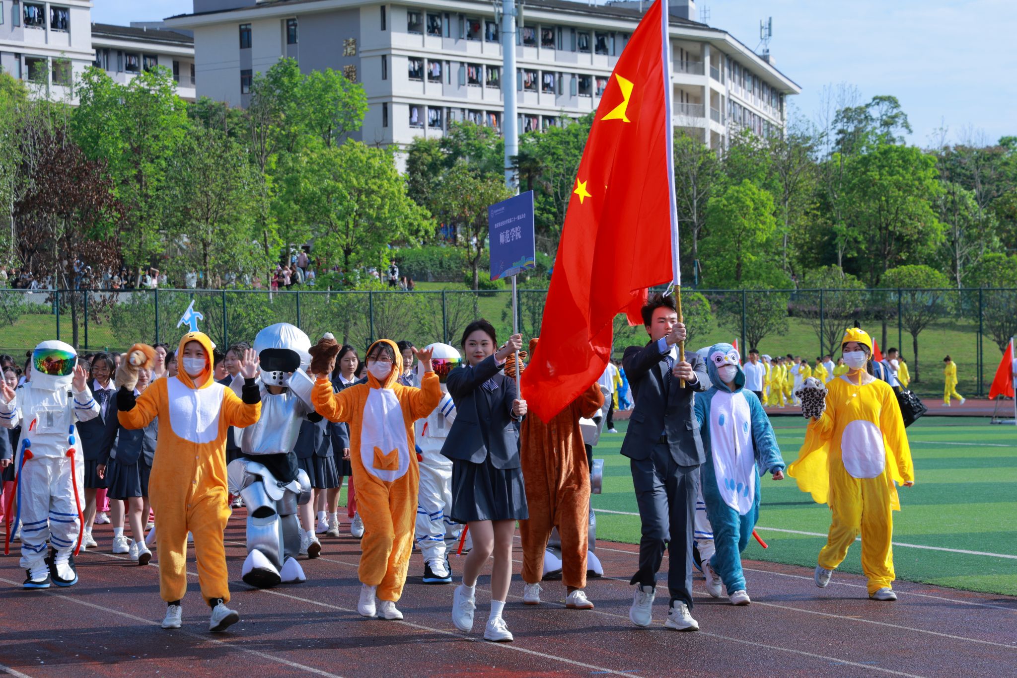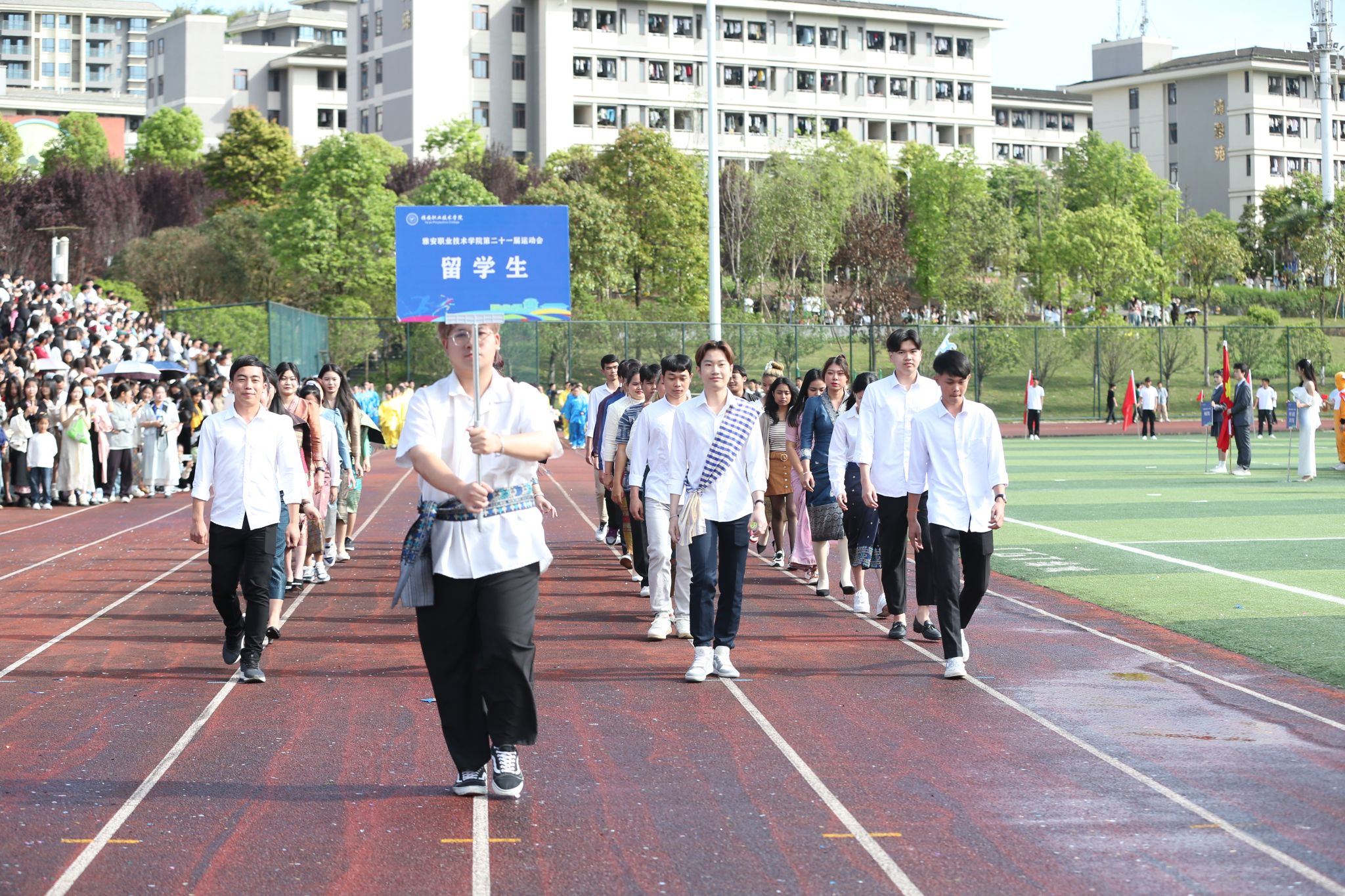 随着6名精神抖擞护卫队员手擎国旗步伐铿锵迈入运动场,开幕式的序幕正式拉开。彩旗方阵、各二级学院方阵、留学生方阵和教职工代表、裁判员等11个方阵昂首阔步走过主席台。各二级学院方阵的着装专业特色鲜明,道具别具匠心,口号声高亢嘹亮,展现了青年学子蓬勃向上的精神风貌。留学生方阵出场赢得阵阵掌声,他们身着本国传统服饰,为运动会增添了国际色彩。教师代表和裁判员方阵步伐整齐,神采奕奕。