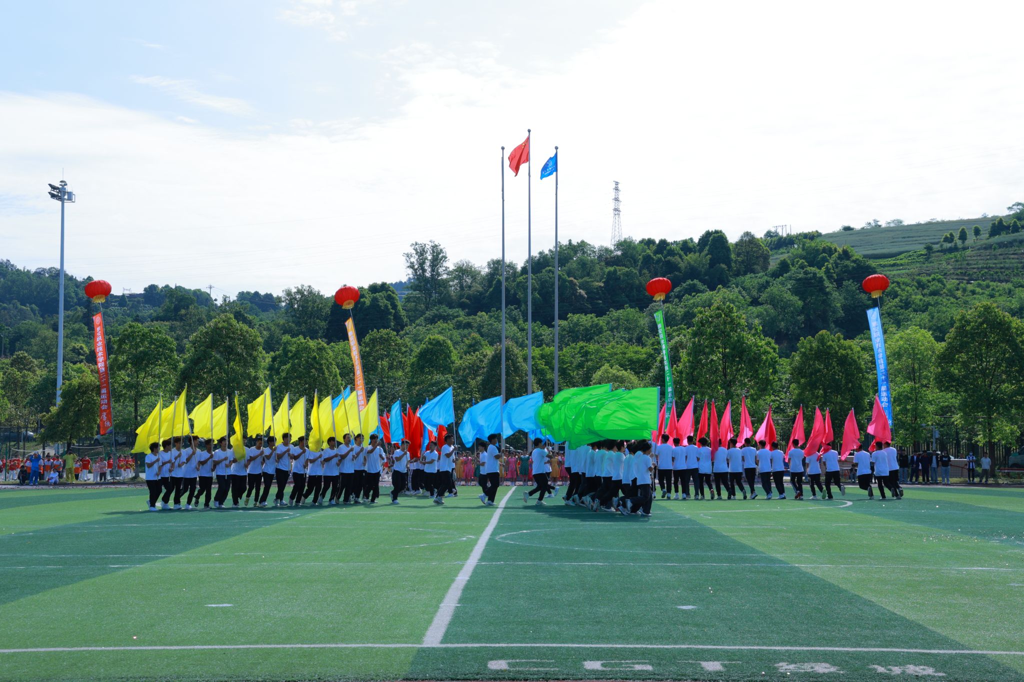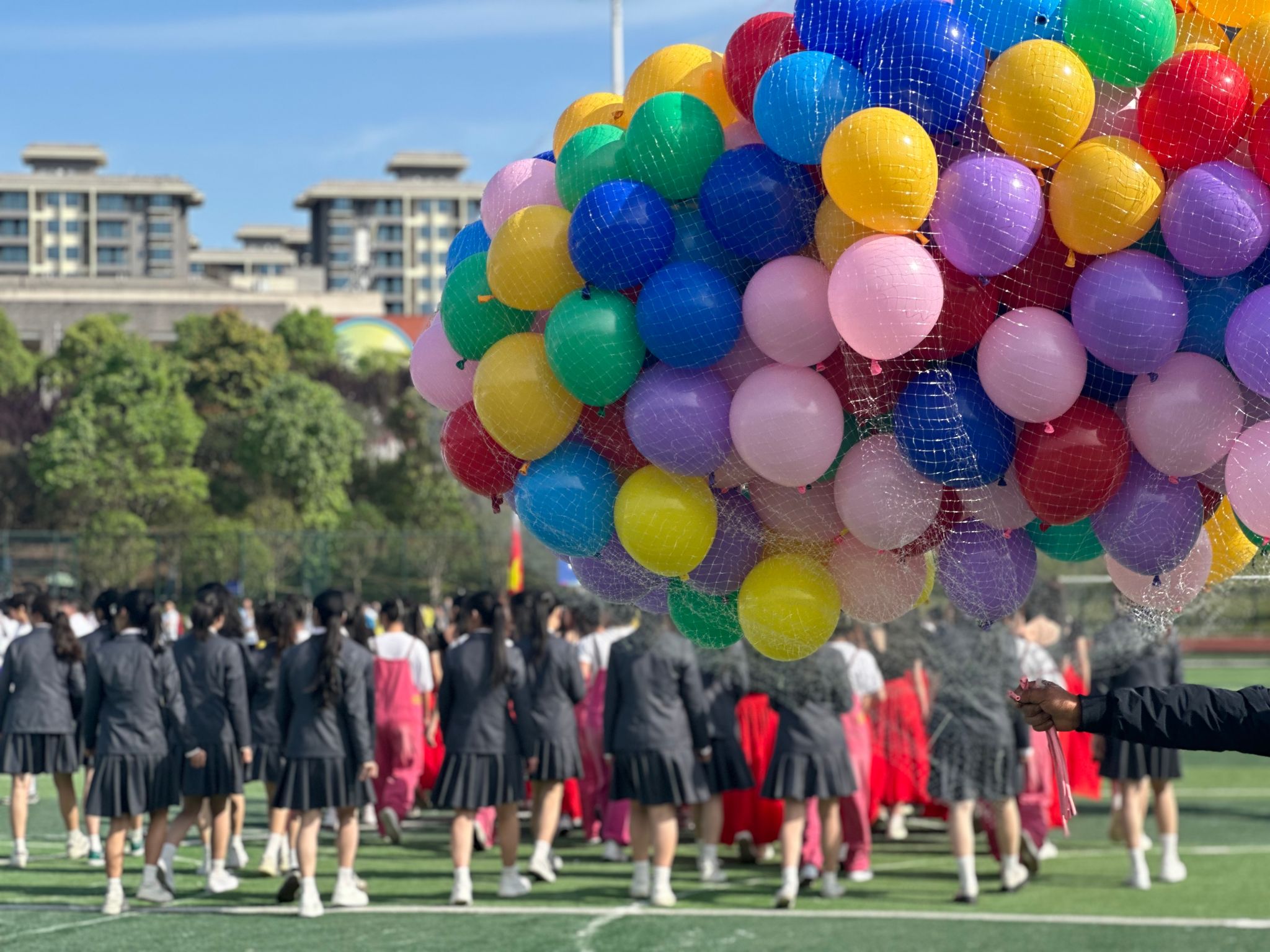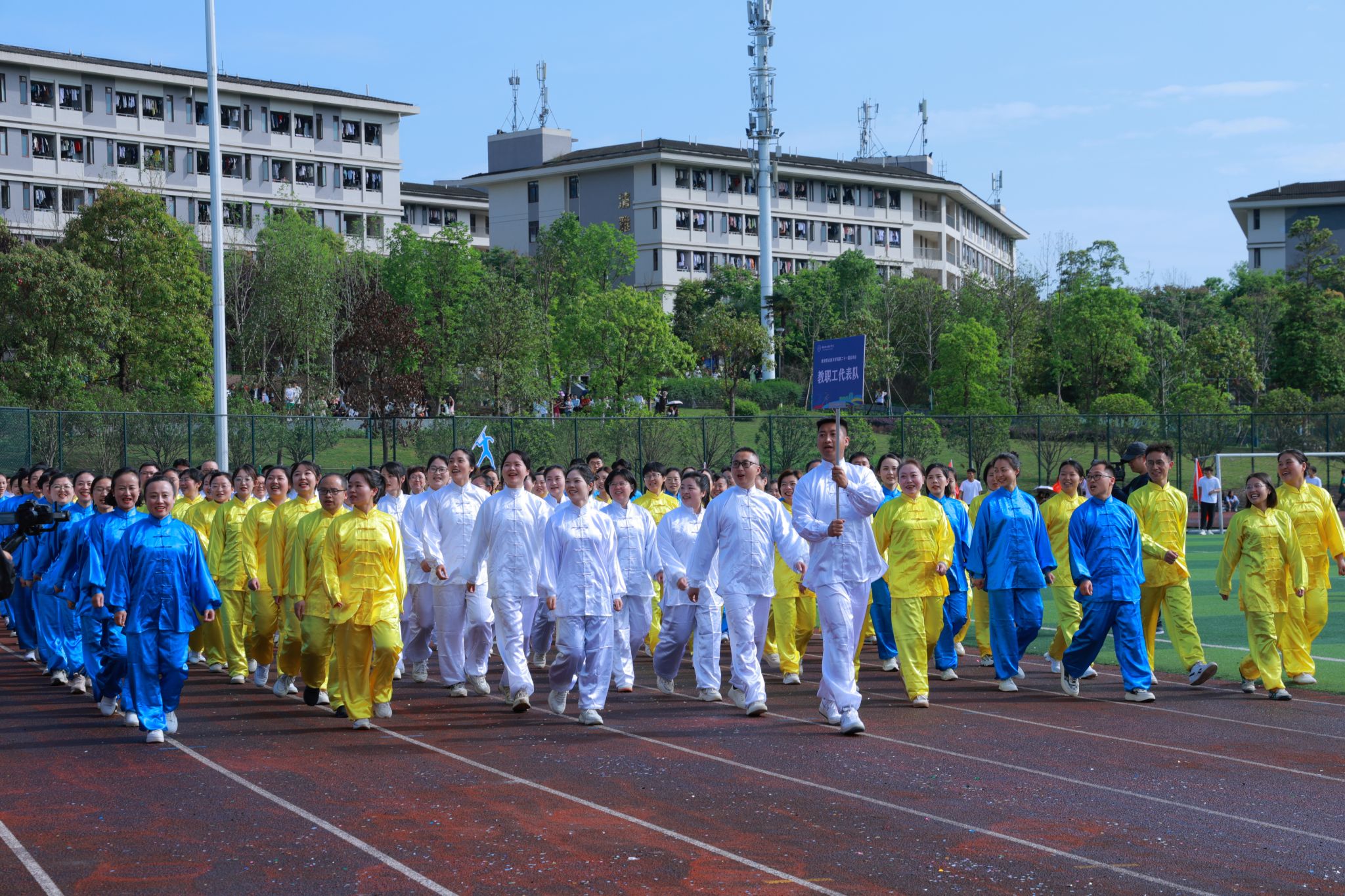 夏安琼宣布运动会正式开幕的话音刚落,现场彩球纷飞、礼乐齐鸣,彩旗队、啦啦操、学生大型团体操、教职工八段锦表演轮番上阵,青春的活力与激情在运动场上尽情绽放,气氛瞬间达到高潮。