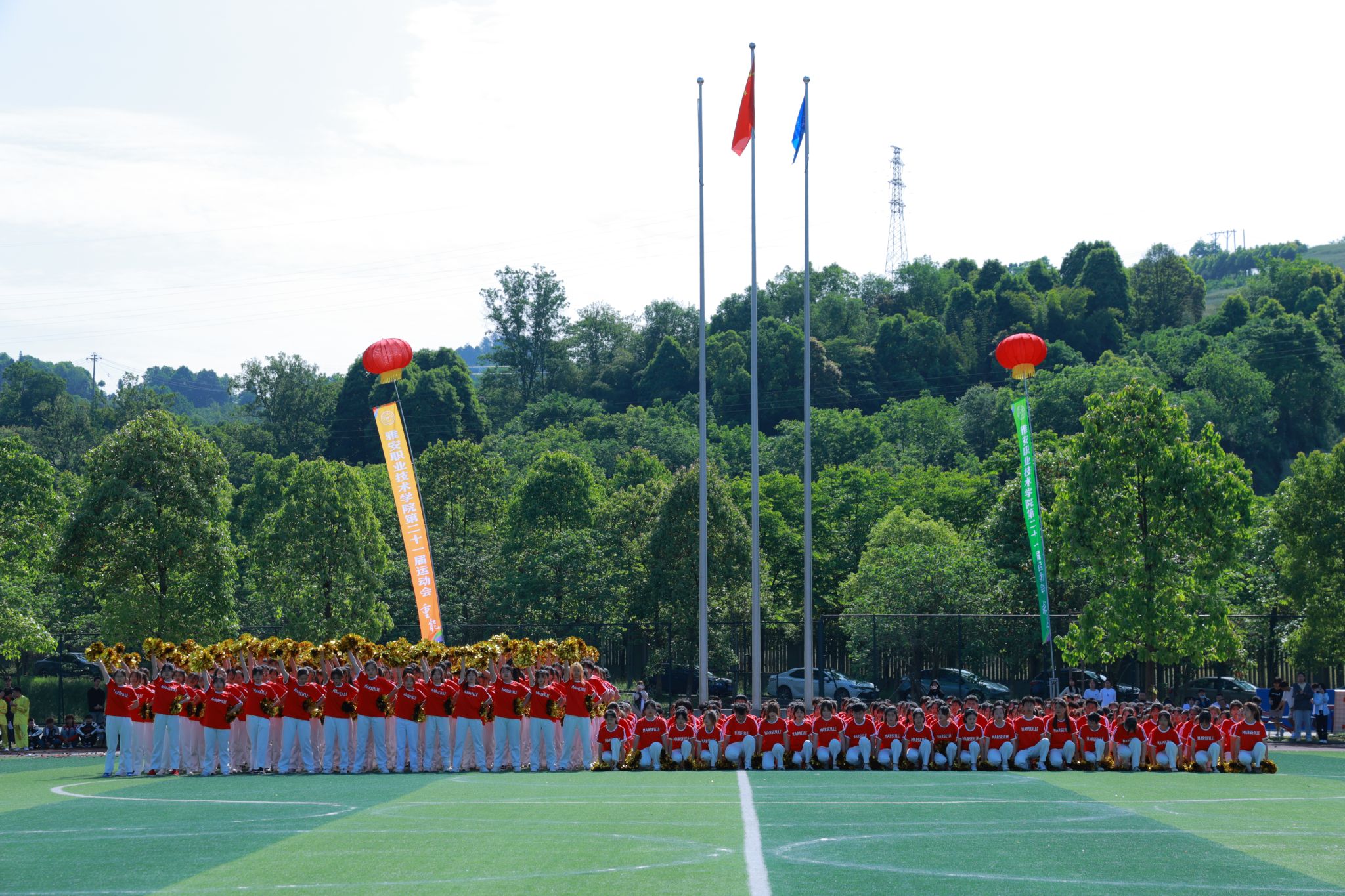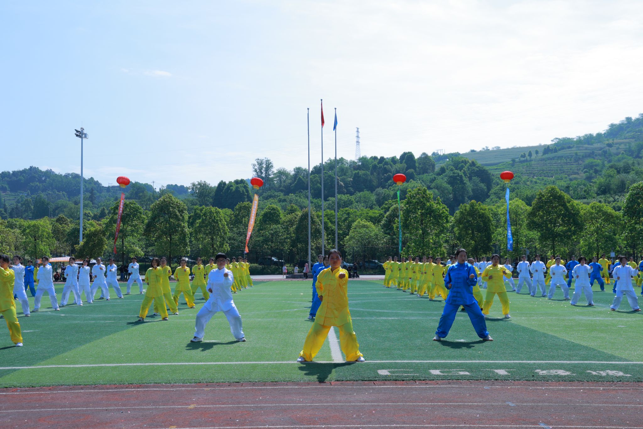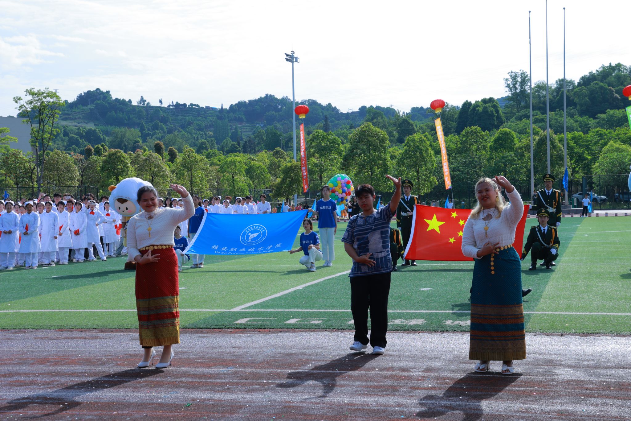 夏安琼宣布运动会正式开幕的话音刚落,现场彩球纷飞、礼乐齐鸣,彩旗队、啦啦操、学生大型团体操、教职工八段锦表演轮番上阵,青春的活力与激情在运动场上尽情绽放,气氛瞬间达到高潮。