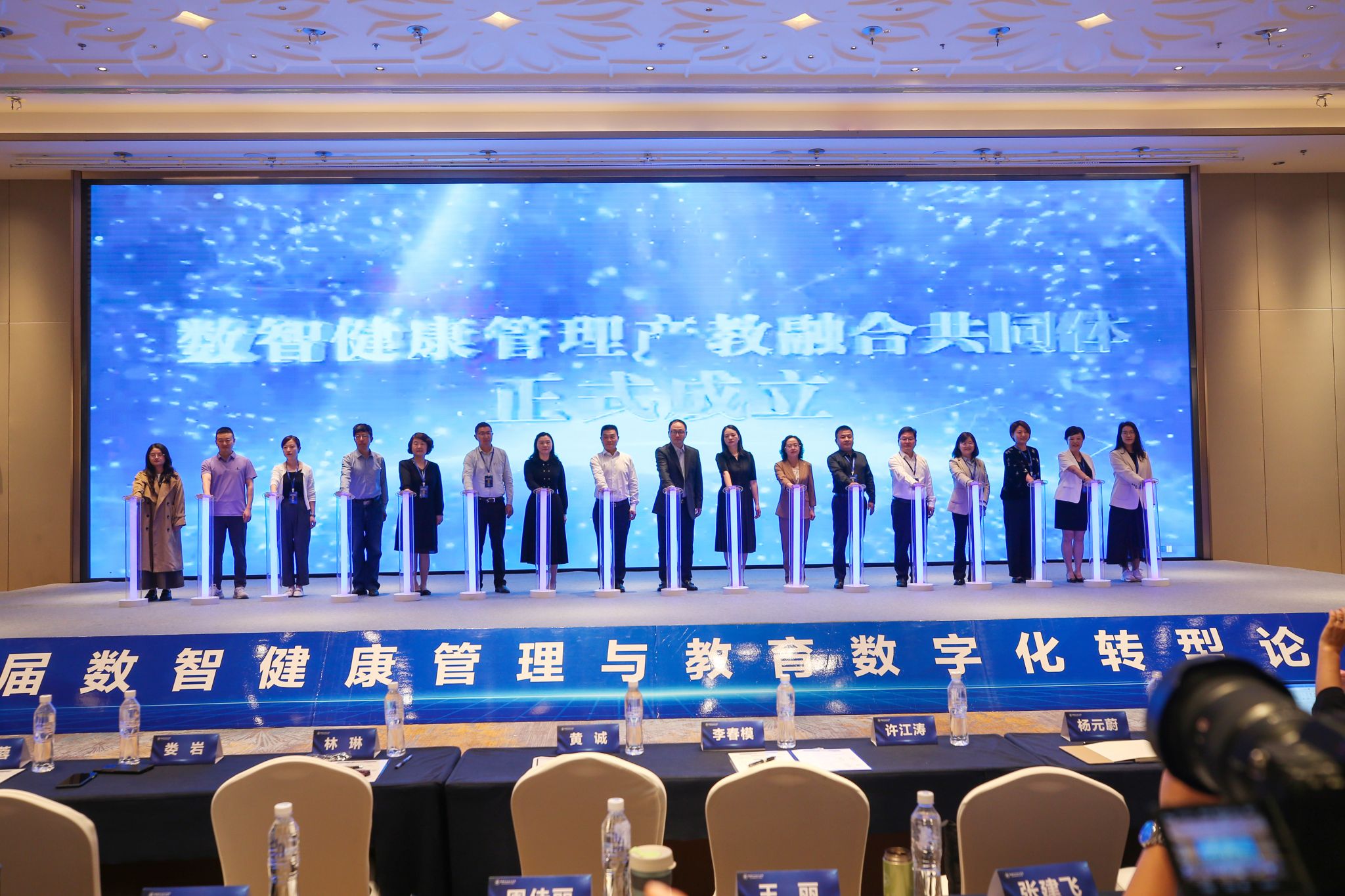 其间,参会人员共同见证了数智健康管理产教融合共同体揭牌仪式。成员单位的代表一起按下启动键,宣告了数智健康管理产教融合共同体正式成立。