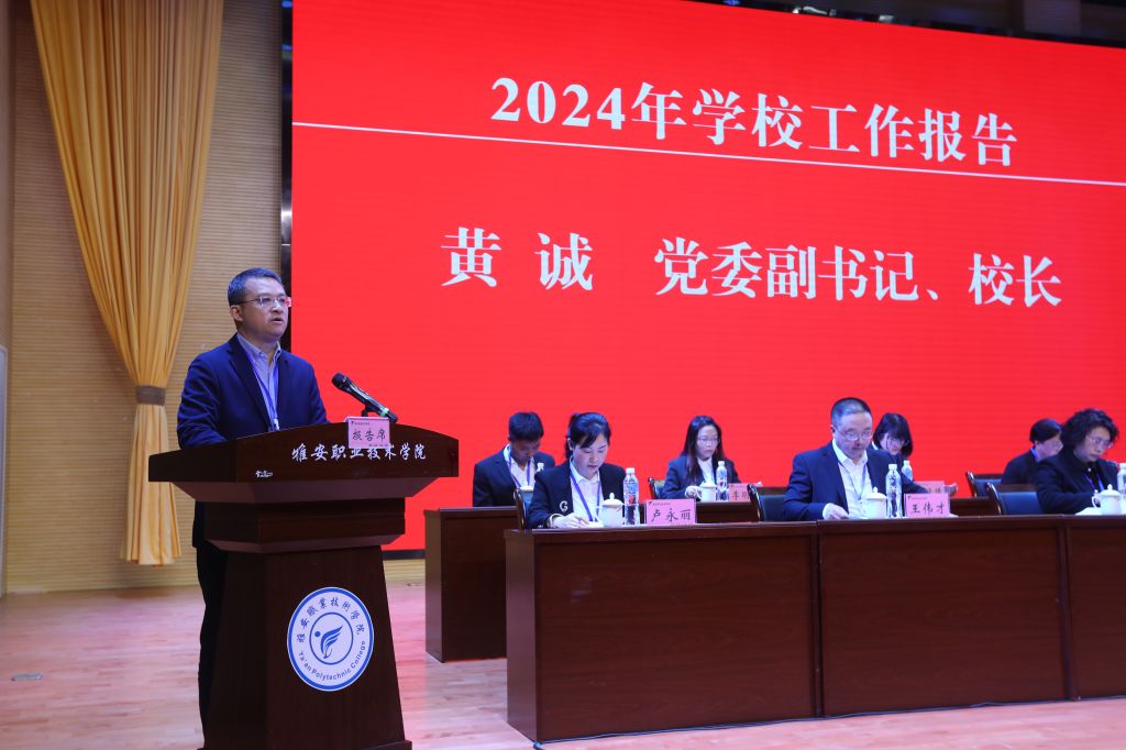 黄诚向大会作题为《赓续奋斗育新人 聚力提质启新城 奋力推动学校高质量发展取得新突破》的工作报告。从党建引领、立德树人、内涵发展、协同创新、内部治理五个方面回顾了学校2024年学校各项事业发展所取得的成绩,客观分析了发展面临的机遇和挑战、存在的问题和短板,并结合校党委第二次党代会提出的奋斗目标和党委二届三次全会确定的改革任务,紧紧围绕“办学能力高水平,产教融合高质量”这条主线,从六个方面对2025年工作作出科学部署。