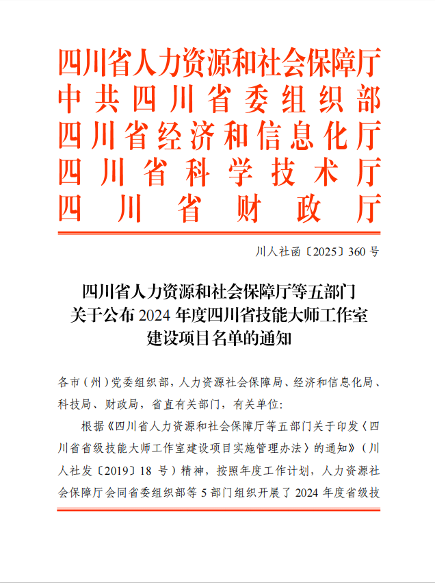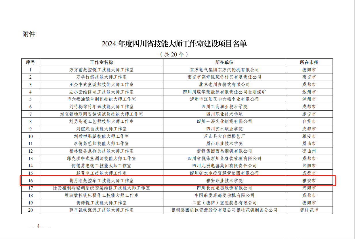 近日,四川省人力资源和社会保障厅等五部门联合发文公布了2024年度四川省技能大师工作室建设项目名单,beat365“胡月刚数控车工技能大师工作室”榜上有名,成为该年度20个省级技能大师工作室建设项目之一。