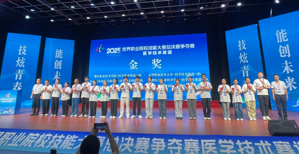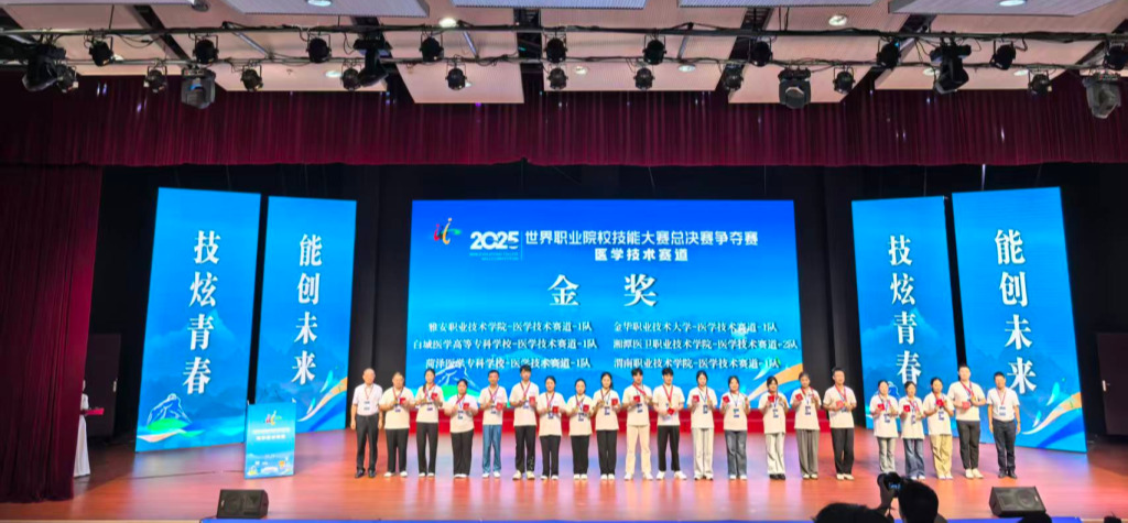 近日,从河南信阳传来振奋人心的捷报!在8月19日至24日于信阳职业技术学院举办的2025年世界职业院校技能大赛总决赛争夺赛(医学技术赛道)上,由学校临床医学院(附属医院)党委副书记吴洁领队,王艳玫、丁小秘两位专业教师指导,陈圣、周思怡、张彤、杨兴茹组成的参赛团队,凭借扎实的专业功底、精湛的技术技能和出色的临场发挥,从全国178支顶尖代表队中脱颖而出,勇夺该赛道金奖。