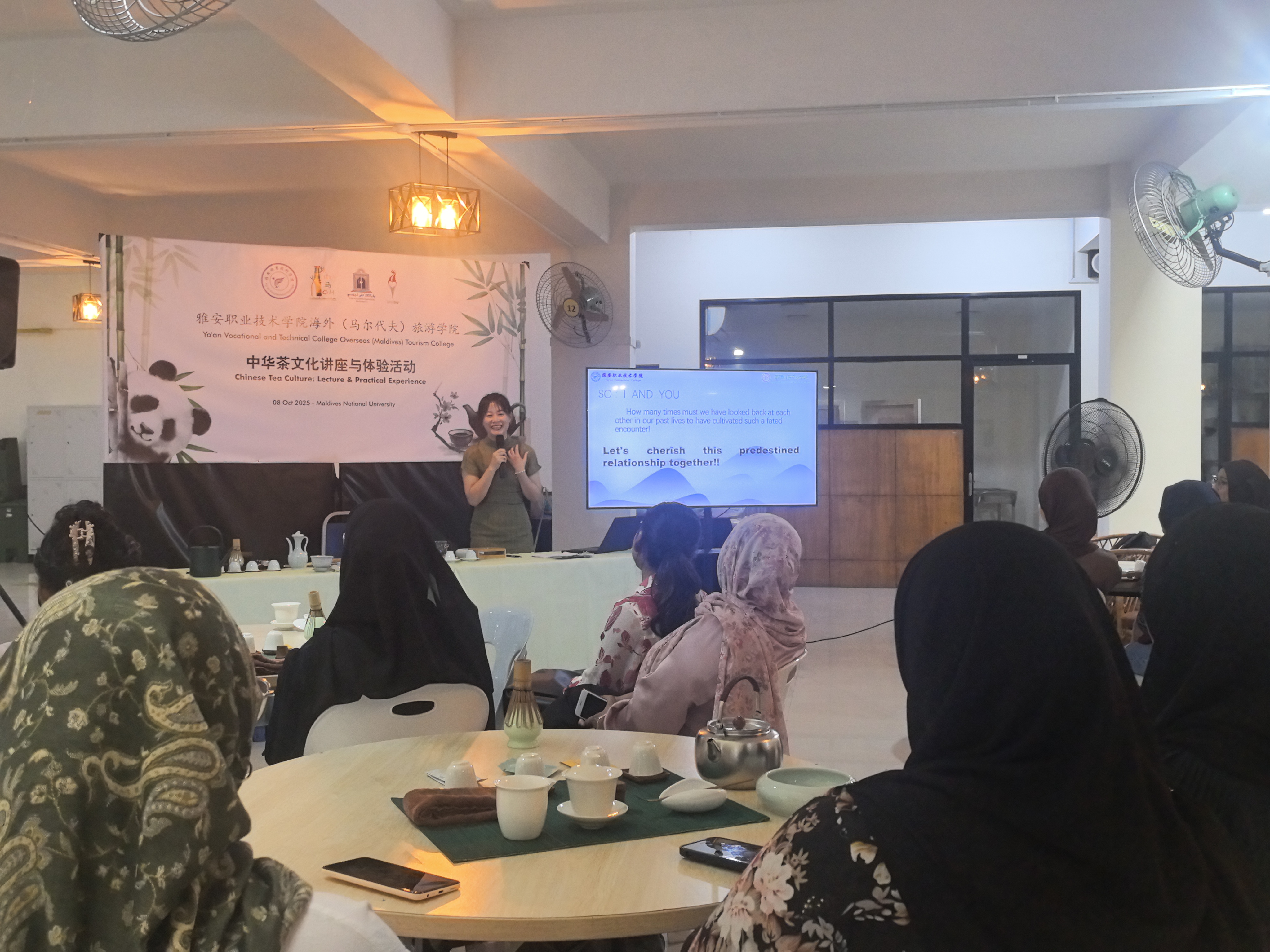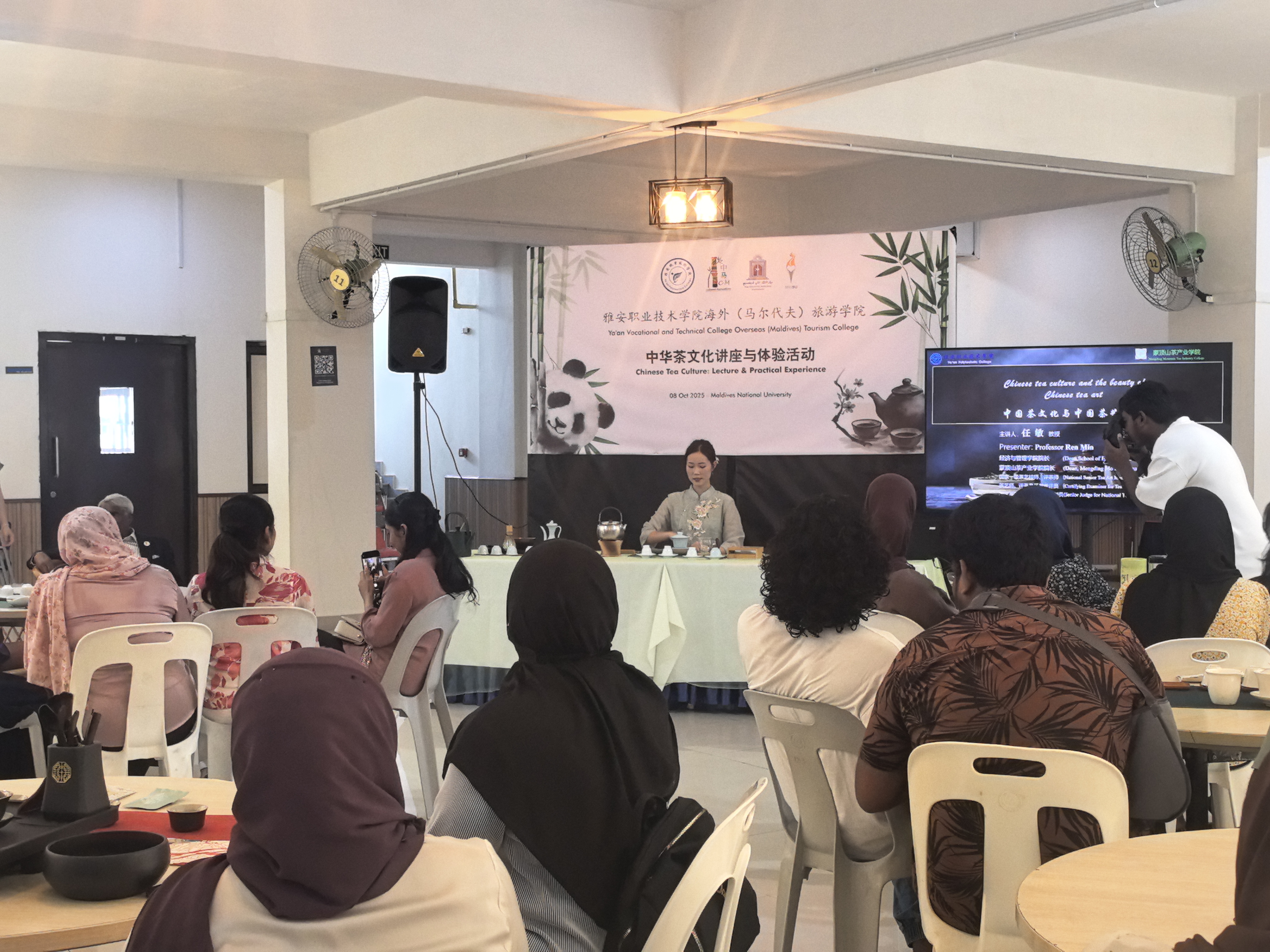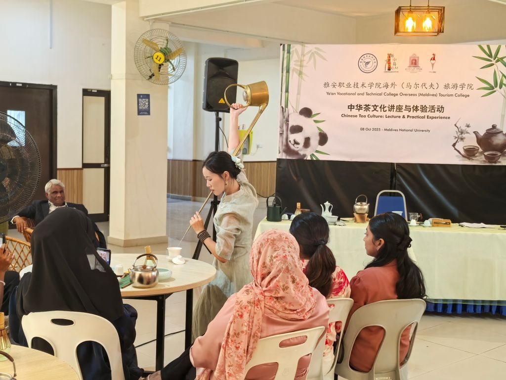 在马尔代夫国立大学,代表团与该校旅游管理学院质量主管阿米娜特・希亚玛等负责人,在学生实训基地就国际化旅游人才培养展开研讨。在国立大学学生活动中心,国家一级茶艺技师任敏教授为师生代表开展了《中国茶品鉴与茶艺鉴赏文化》主题讲座,系统介绍六大茶系与茶道内涵。李仪莹展示了中国盖碗茶技艺、长嘴壶“龙行十八式”,并现场培训,师生进行了沉浸式体验,激发了对中华茶文化的兴趣。