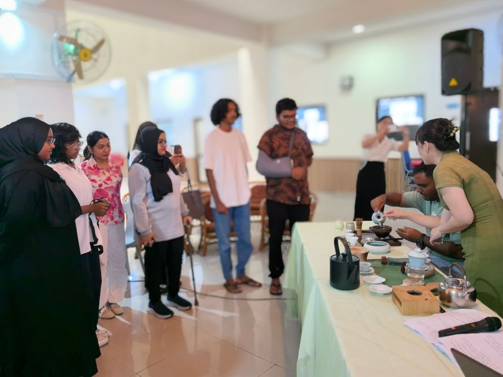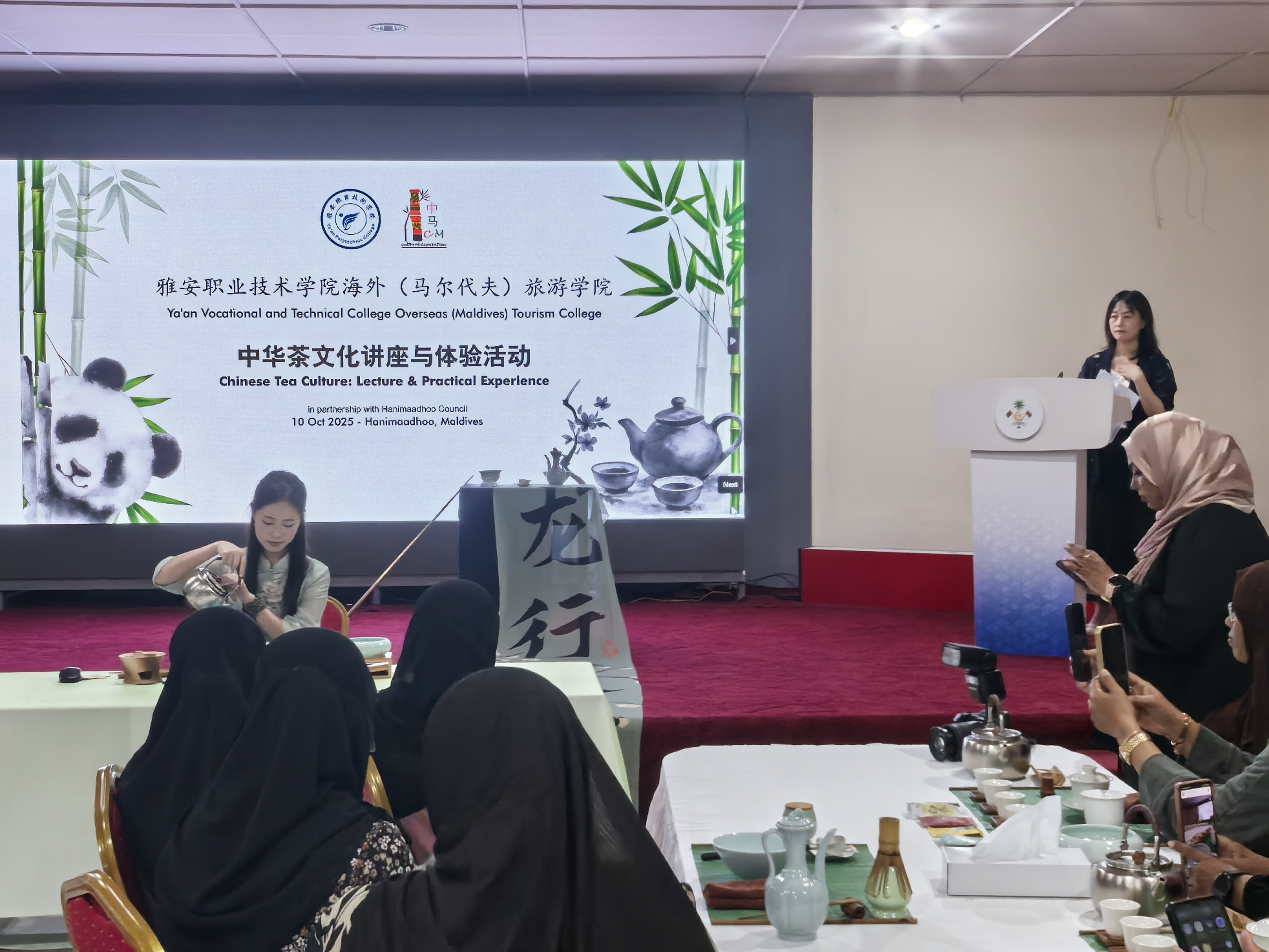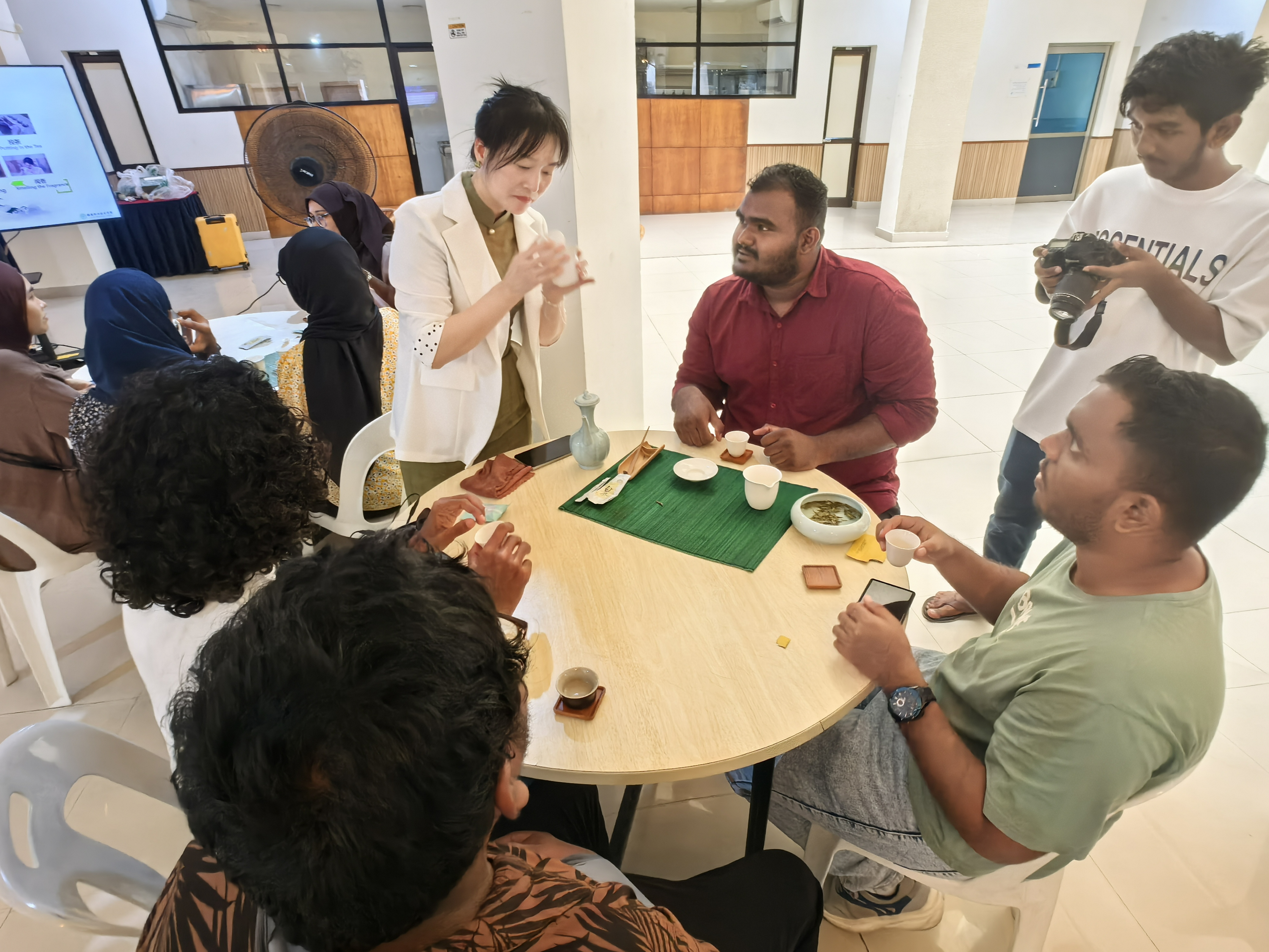 代表团拜会了哈尼马杜岛理事会主席阿卜杜勒・萨塔尔・哈桑,探讨双方开展语言培训、文化交流的有效路径。代表团在岛上活动中心开展了“中文+茶艺职业技能”、《生活茶艺》培训讲座,展示中华现代茶艺与宋代点茶技能、长嘴壶“龙行十八式”技艺,岛上居民热情参与中文培训和茶艺体验。
