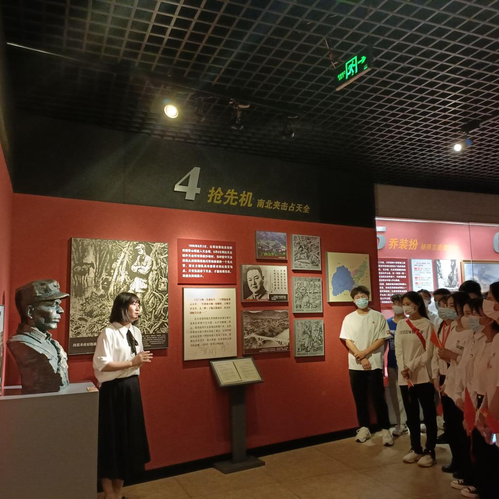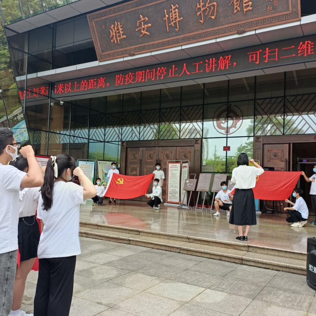 活动开始全场齐唱国歌,刘琴带领大家再一次学习了习近平总书记在庆祝建团一百周年大会上的讲话精神,寄语青年团员要铭记历史,肩负重任。张晓惜带领大家重温入团誓词,鼓励青年不忘初心,将共青团的优秀品质延续下去,努力做好党的后备军。随后,全体人员进入博物馆——红军长征在雅安展馆参观,沉浸式感受革命先烈那段峥嵘岁月的动人故事。张晓惜在胡长保烈士的雕像前以“守护”为主题为大家讲述了一堂生动的团课。寄语团员青年不负韶华,勇于担当,坚定理想信念,锤炼专业本领,用奉献和奋斗守护家国。