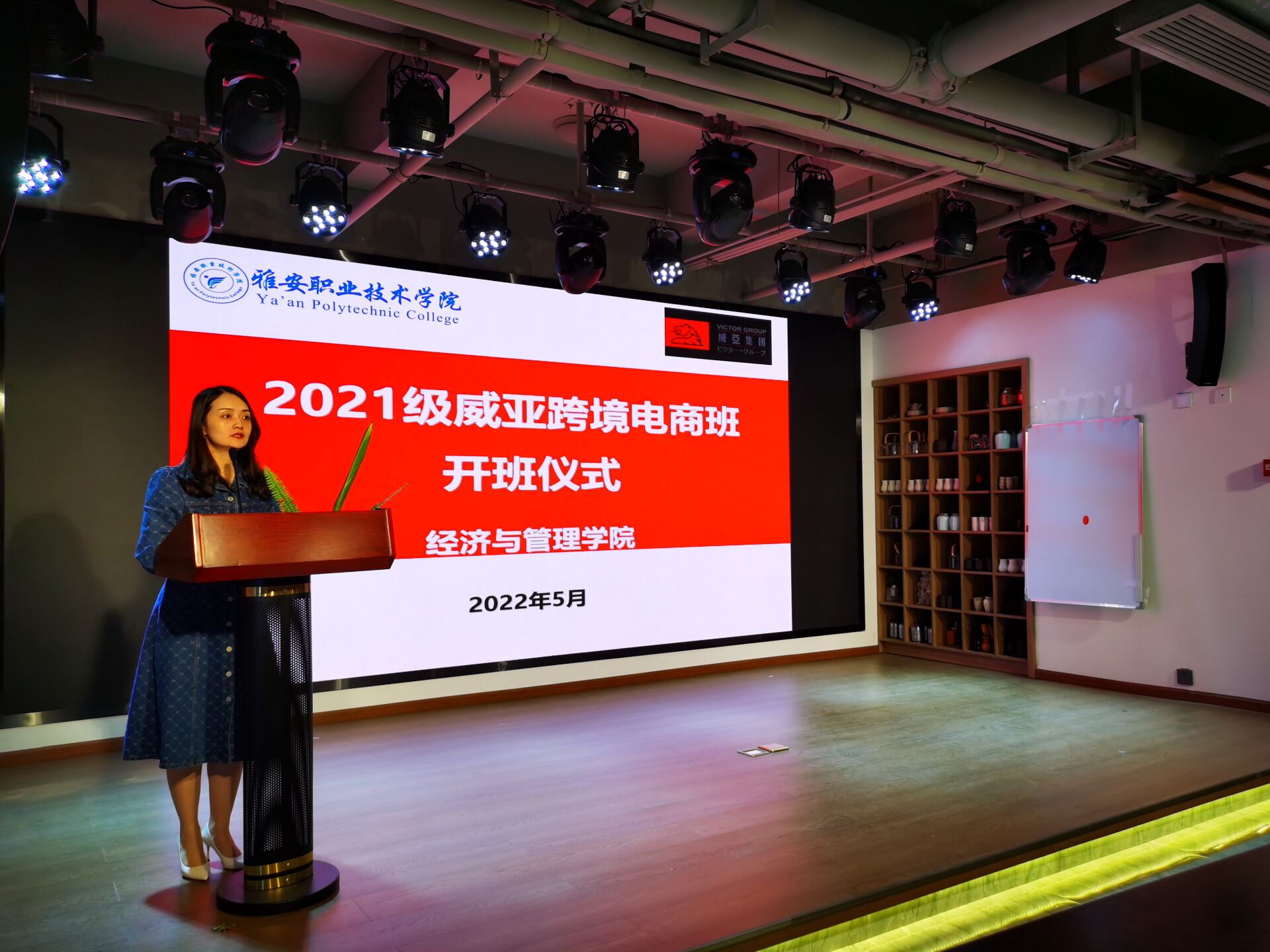5月16日,经济与管理学院携手雅安威亚科技有限公司在茶创空间举行了“2021级威亚跨境电商班开班仪式”。经管学院直属党支部书记高运荣、院长胡祥昌、副书记任敏、威亚集团雅安分公司总经理汪明书、专业教师以及2021级跨境电子商务专业全体学生参加了此次开班仪式。会议由经管学院物流与电商教研室主任姜庆主持。
