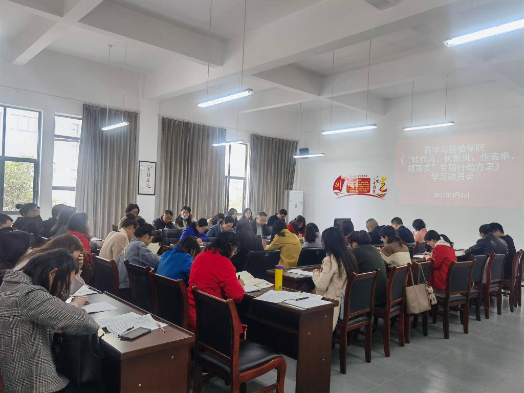 按照学校党委“转作风、树新风、作表率、抓落实”专项行动工作的要求,药学与检验学院为进一步加强作风建设,推动药学高水平专业群建设工作,3月8日中午,召开了“转作风、树新风、作表率、抓落实”专项行动方案学习动员会。药检学院全体教职工参加了学习动员会,会议由药检学院党总支书记王伟才主持。