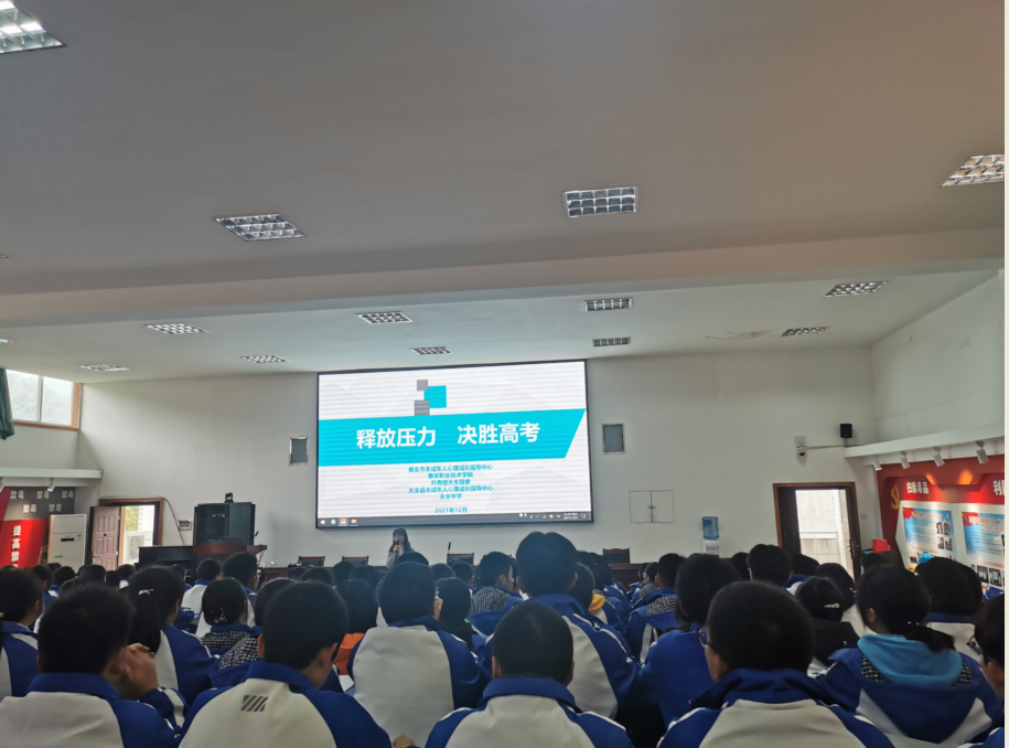 为进一步深化校地合作,发挥专业优势,服务地方发展,帮助进入冲刺阶段的中高考学生缓解释放压力,以更加积极的良好心态迎战中高考。12月2日,雅安市未成年人心理成长指导中心组织心理教师王丽、王可晖、侯述娟、刘璐、燕莉梅赴天全一中、天全中学开展中高考生减压专题心理辅导。学院5名学生志愿者协助,天全一中200余名初三学生、天全中学160余名高三学生参与活动。
