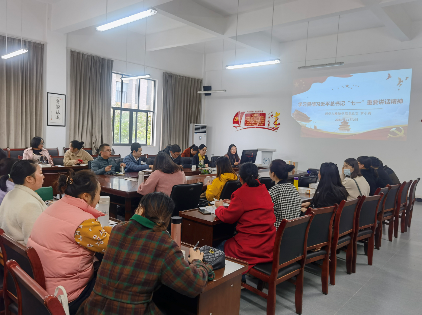学习围绕习近平总书记“七一”重要讲话的重大意义、主要内容和丰富内涵进行,深入解读了中国共产党百年奋斗历程、伟大成就、宝贵经验和实践启示,阐释了伟大建党精神的深刻内涵和时代价值,同时对讲话中提出的一系列新思想、新观点、新要求进行了梳理,系统讲解了一个庄严宣告、一个奋斗主题、四个伟大成就、一个伟大建党精神、九个根本要求、一个祖国统一、一个希望寄予青年、一个号召全体党员会议要求全体教职员工要认真学习,深刻领会,将精神落实到专业建设、课程建设、人才培养等具体工作中去,落实立德树人根本任务,实现药学与检验学院各项工作提质培优。