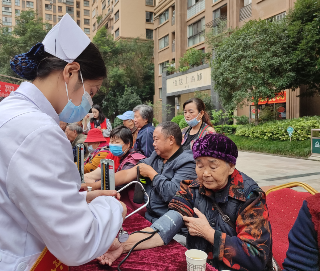 身着红色志愿服和白色护士服的志愿者们有序开展了义诊活动 。一组为社区居民宣讲“合理膳食,健康生活”及高血压预防相关知识,一组为社区老人测量血压。张雪庆为老年人宣讲急救知识,强化老年人卫生健康意识;黄丹指导志愿者为老年人进行健康护理。志愿者热情的服务得到了居民们的一致好评。