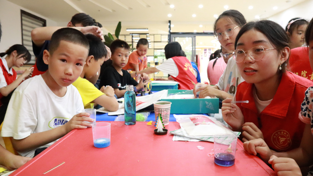 团队成员穿上红马甲,来到四包村党群服务中心,为在场的50余名留守儿童开展跳跳课间操,爱的抱抱,三人四足,歌唱舞蹈等丰富多彩的小游戏,现场温情满满。随后,学院心理专业教师王丽为孩子们带来心理团体辅导活动,通过集体参与的方式,提升孩子们相互沟通交流的能力,让每一位孩子因活动而快乐,因快乐而健康。下午,“七彩童伴”实践团一行来到名山区新城社区为现场30余名孩子开展童伴志愿服务活动。团队成员们精心准备了科学DIY实验、手工拼装涂鸦、拓展训练、快乐跟拍等丰富多彩的趣味课程,让孩子们在欢声笑语中既学习知识,又动手动脑,感受科学学习的快乐和喜悦。