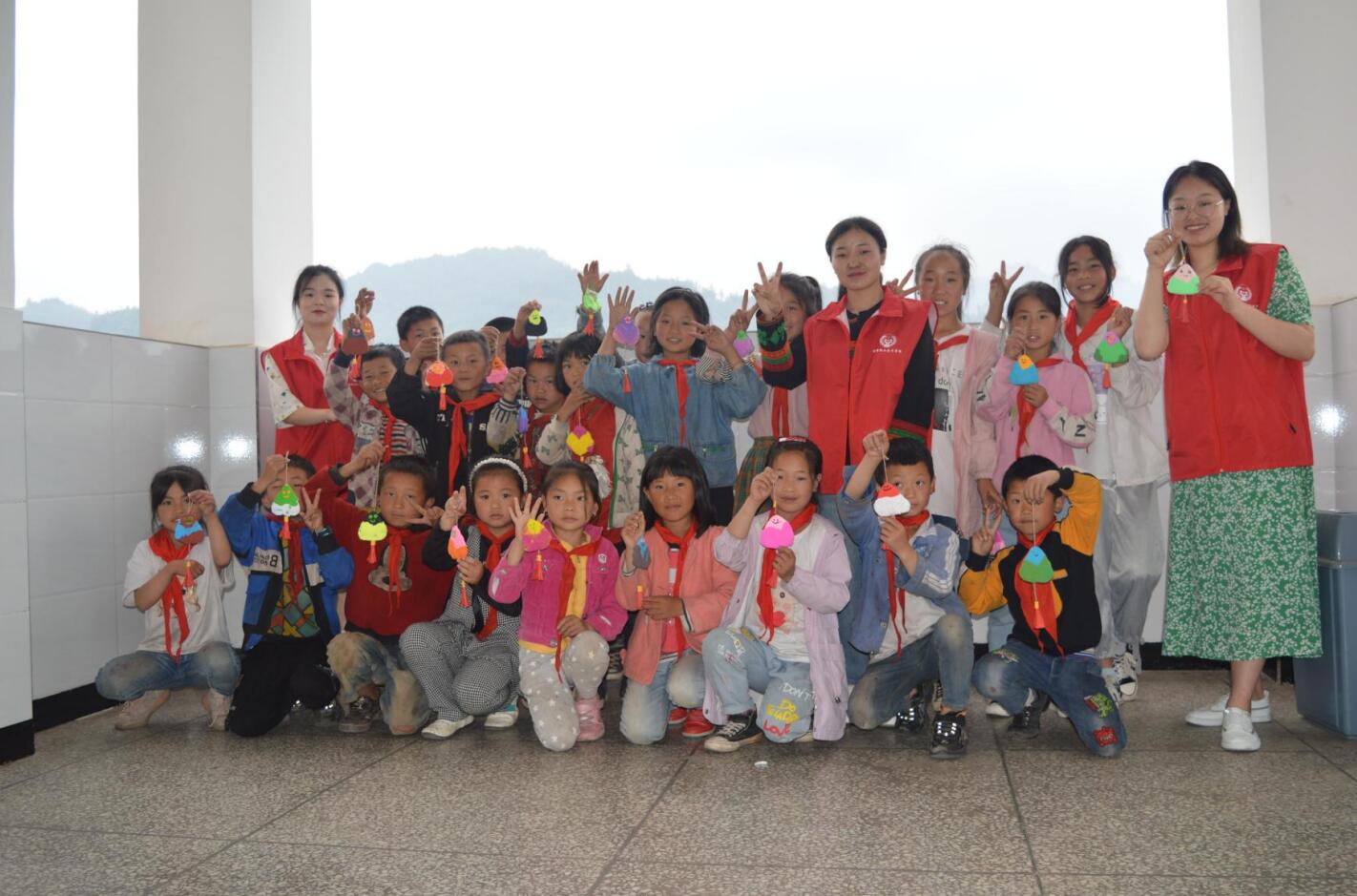 老师们带领志愿者服务队与来自荥经县民建乡中心小学共260名彝族学生一起开展了丰富多彩的活动。大家在活动中运用绘画、手工、唱歌等方式和彝族孩子们进行互动,不仅让孩子们感受幸福的童年,还让孩子们知道如何适当宣泄情绪,教会孩子们怎样增强自信,怎样通过心理暗示激发潜力。