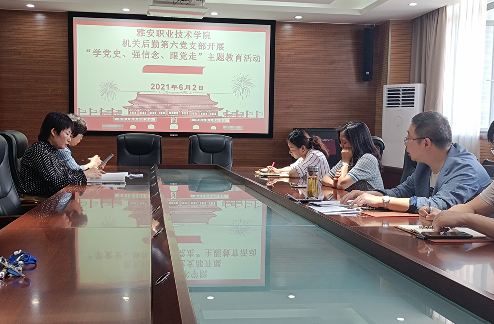 6月2日中午,机关后勤第六党支部在经开区校区行政楼303室开展了“学党史、强信念、跟党走”主题教育活动,活动由党支部书记宋峰主持。第六党支部15名党员干部现场观看了《红色的追寻(二):星火燎原》视频。