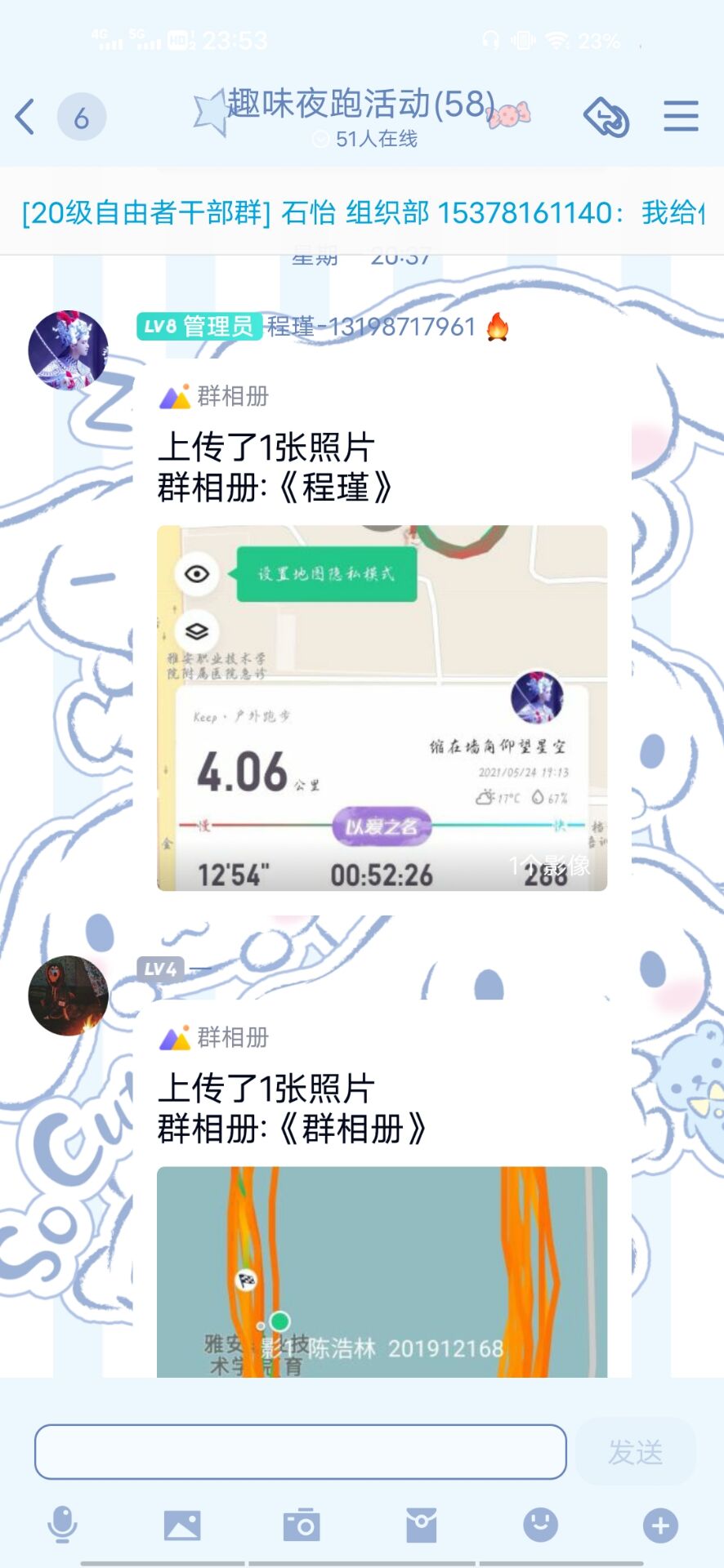 活动为采取上传截图的方式进行,参赛同学安装keep运动软件,自行组织团体夜跑活动或独自夜跑,每天在23:30前上传keep软件上跑步路线及里程截图,以活动里程为标准,从高到低进行排名。工作人员每天提醒同学们上传照片,并实时记录同学们的夜跑行程。参赛同学们情绪高涨,争先恐后,按时上传自己的夜跑记录,最终曹宇航以67.55公里的好成绩夺得了第一名,第二名李岳霖共计里程40.56公里,第三名颜政政共计里程31.02公里。