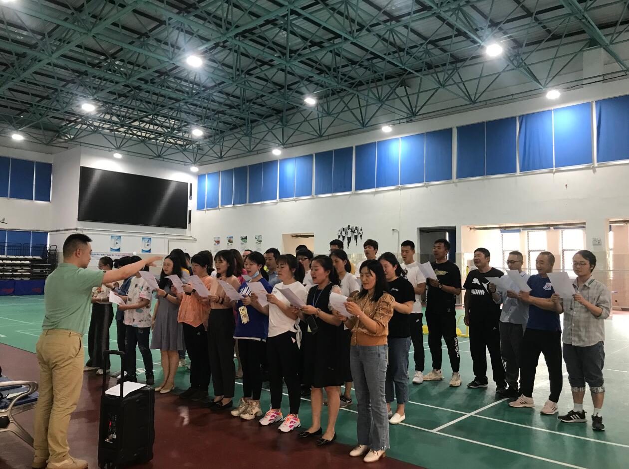 为参加四川省教育系统庆祝中国共产党成立100周年暨“欢歌新时代、颂歌献给党”百场红歌大传唱活动,确保高质量完成这个光荣任务, 5月11日,中医与康复养生学院直属党支部和工会小组组织全体教职工利用午休时间在经开区校区体育中心认真排练大合唱《没有共产党就没有新中国》。