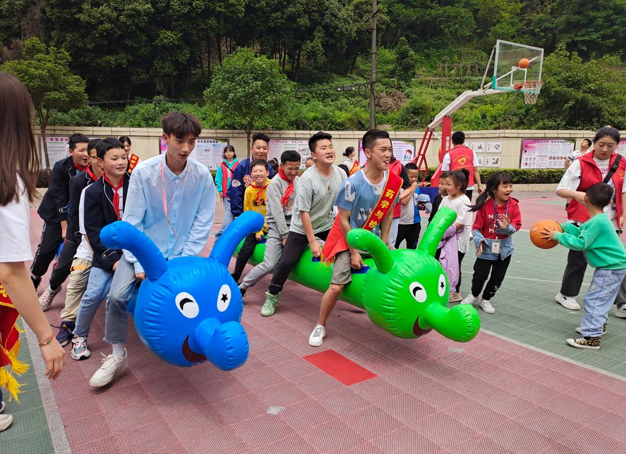 志愿者带上充足的活动物资布置好活动会场,在老师的引领下和六一班的同学们认识,做好了54名小朋友的游戏分组安排。在小朋友的欢呼与期待中,活动正式拉开了帷幕。热身舞蹈传承环节中,志愿者带领小朋友们一起学习《你笑起来真好看》的课间舞蹈,同学们虽然有些害羞但都认真学着。在“趣味游戏时间”环节,小朋友们按照分好的小组进行“齐心协力同心鼓”和“疯狂毛毛虫的比赛”,志愿者们做好记分、安全保障等后勤工作,不论头顶的太阳有多烈,每个志愿者都恪尽职守。游戏放松时间结束后,志愿者们也分组和小朋友们谈心闲聊,了解他们近期的困扰、压力,对小朋友进行宽慰、指导,帮助他们减轻心理负担,用真诚的心帮大家加油鼓劲。