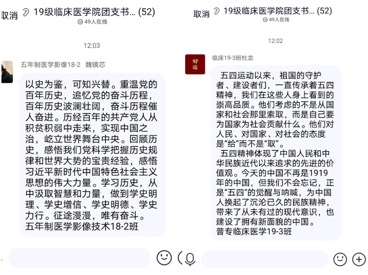 又是一年五四,属于青年的节日,在院团委的部署下,临床医学院团总支组织47个在校团支部在线学习观看“学党史 强信念 跟党走”主题云团课,并展开专题讨论,共度五四青年节。