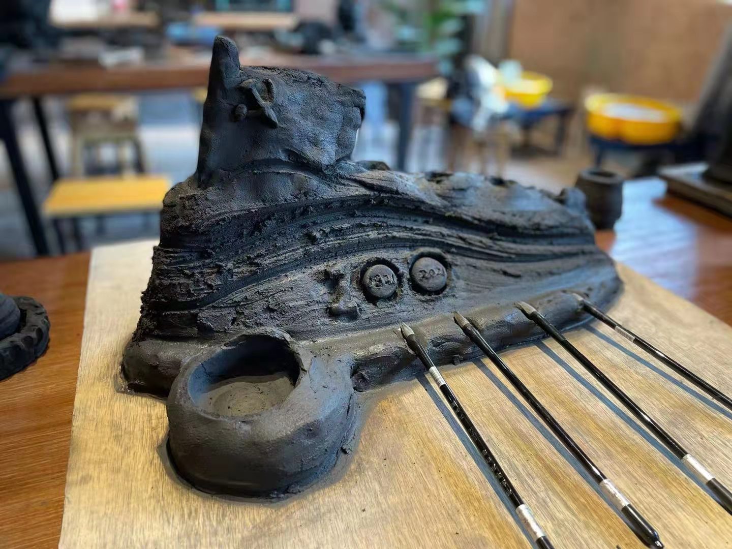 陆小路和陈鑫作为指导老师,指导师范学院学前教育、早期教育等专业的同学参与黑砂创作活动,带领同学们参观了荥经县黑砂企业,了解荥经黑砂制作流程及烧制工艺,并向传统手工艺人学习。