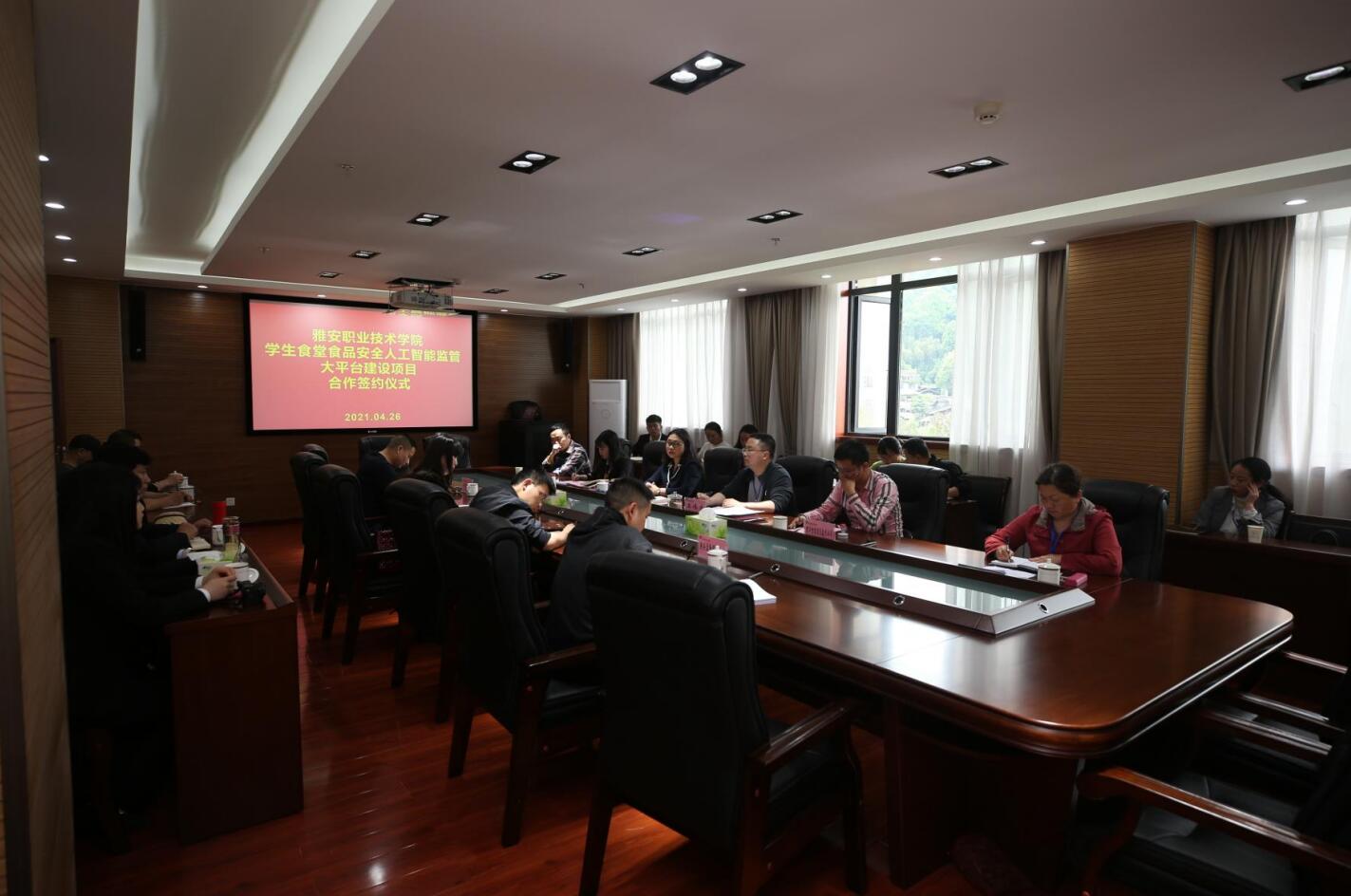 为进一步保障学院各校区师生就餐安全,提高学生食堂食品安全等级,按照《四川省教育厅关于推进四川省学校食堂食品安全智能化管理系统建设的指导意见》,学院决定在三校区学生食堂建设食品安全人工智能监管平台项目。经过前期的试点、商谈和筹备,4月26日下午,学院学生食堂食品安全人工智能监管大平台建议项目合作签约仪式在经开区校区综合楼303会议室举行。学院工会主席夏安琼、项目投资建设方雅安蜀天商贸有限责任公司总经理杨薇、项目技术方四川君华智能信息技术集团有限公司总经理潘海军、项目服务对象学院三校区四家相关食堂托管经营餐饮公司签约负责人、后勤管理处食品安全监管科工作人员等二十余人参加签约仪式,签约仪式由后勤处处长王伟才主持。