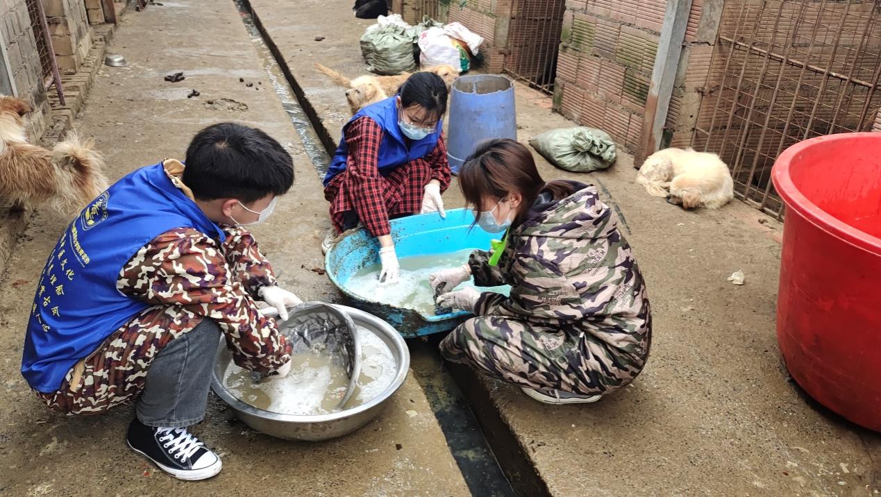 活动中,志愿者们认真打扫基地卫生,分配宠物粮,安置宠物窝等,并将此前志愿者们组织募捐得来的35件衣物、12袋狗粮、1袋羊奶粉、1袋动物尿垫以及330元善款捐赠给该基地,以实际行动表达对流浪动物的关爱。