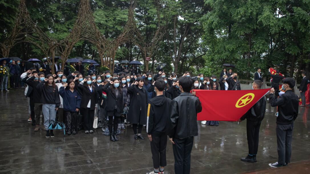 早上九点,祭奠活动正式开始。学生代表为烈士敬献花篮,全体师生默哀一分钟,缅怀革命先烈。学生会执行主席李紫晶带领全体团员重温入团誓词,铿锵誓词,传递了雅职学子不忘初心永远跟党走的决心。