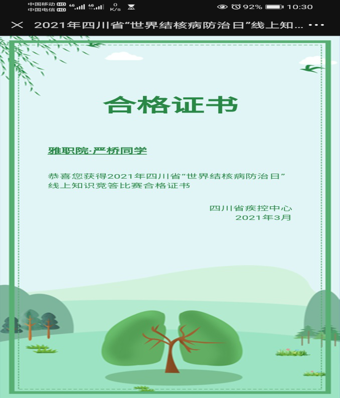 2021年3月24日是第26个“世界结核病防治宣传日”,今年的宣传主题是“终结结核,自由健康呼吸”。为进一步贯彻落实 “师生健康中国健康”主题健康教育活动和创建“无结核校园”的要求,充分发挥广大学生群体在结核病防治活动中的积极作用,进一步动员全社会行动起来共同预防和控制结核病,全面提高学院学生的防痨意识,学院开展了形式多样的结核病防治知识宣讲。