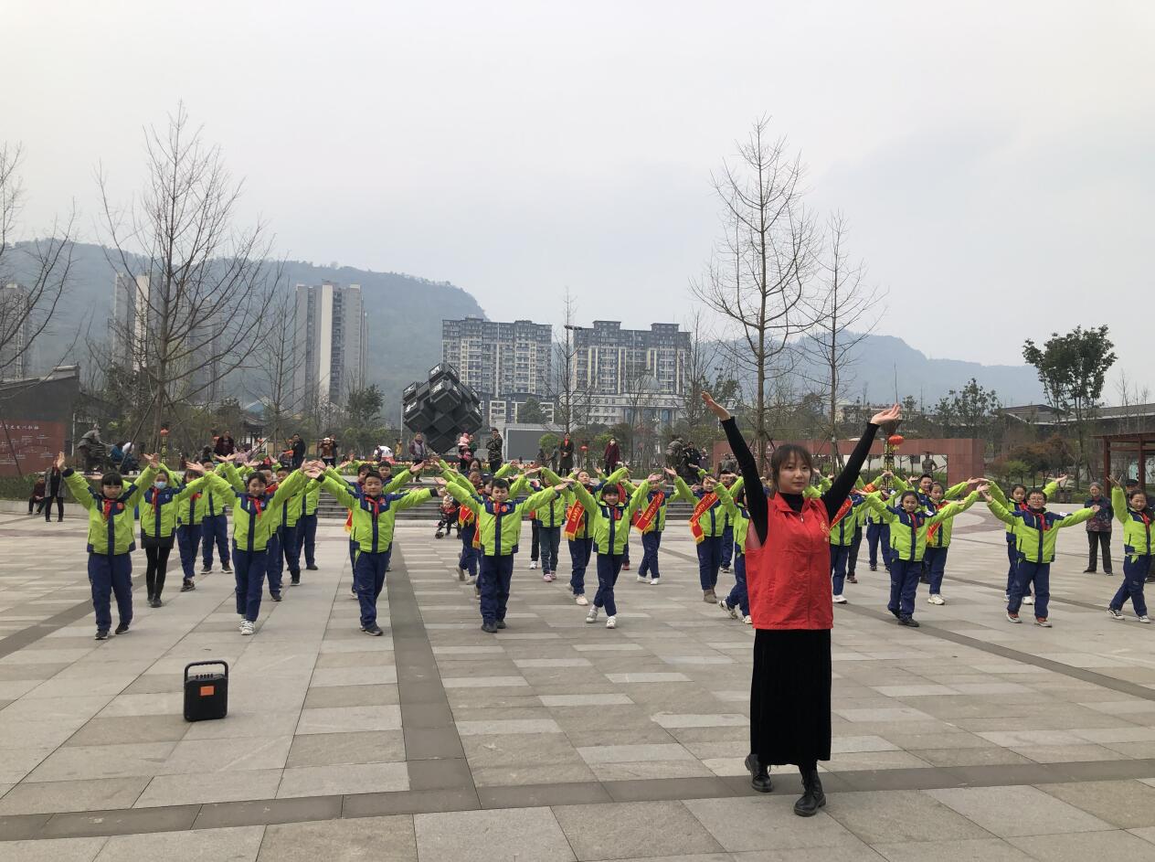 来自学院雅韵大学生艺术团的志愿者带领雨城区第四小学30名同学们在广场上跳起舞蹈“祖国的花朵”,青春活泼的曲风和热情洋溢的笑脸像一条青春靓丽的风景线立刻吸引了公园民众的关注。