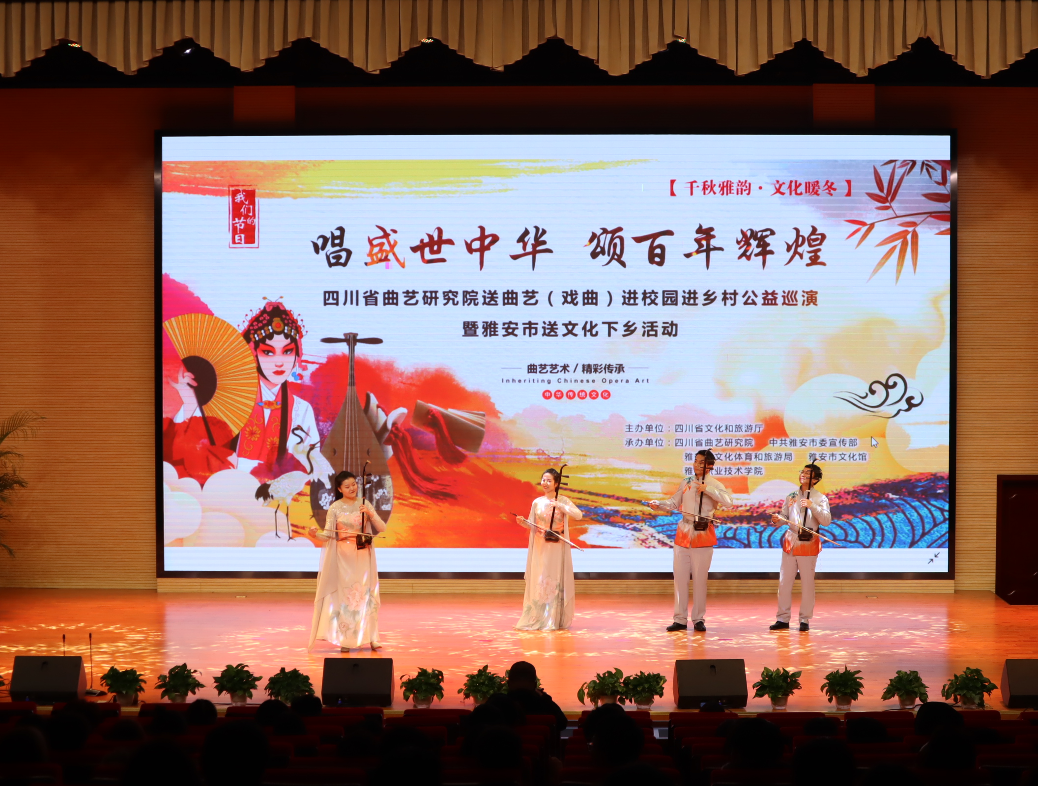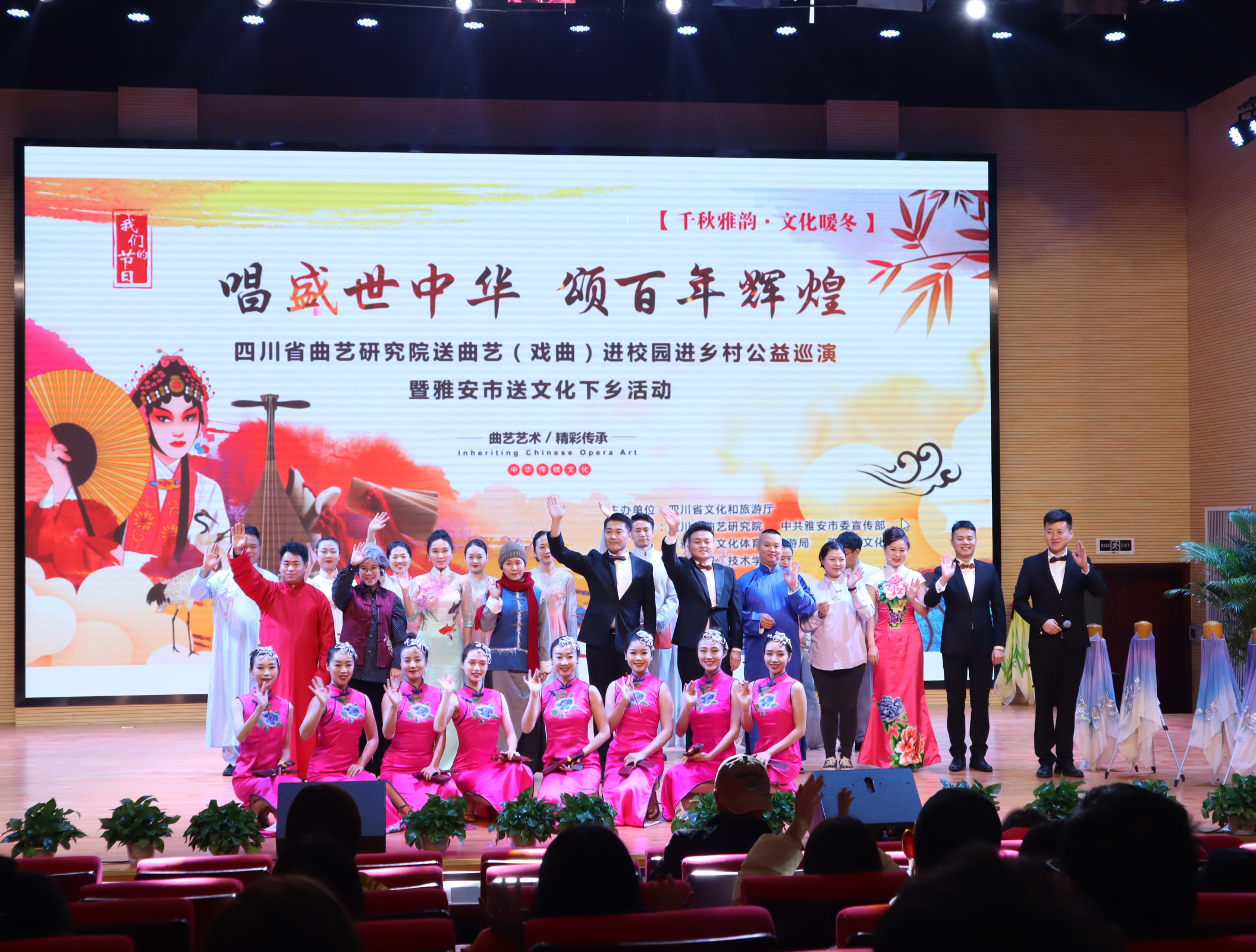 12月7日,由四川省文化和旅游厅主办,四川省曲艺研究院、中共雅安市委宣传部、雅安市文化体育和旅游局、雅安市文化馆和beat365在线唯一官网联合举办的“唱盛世中华,颂百年辉煌”戏曲进校园巡演活动在我院经开校区聚雅厅顺利举行,200余名师生到场观看。