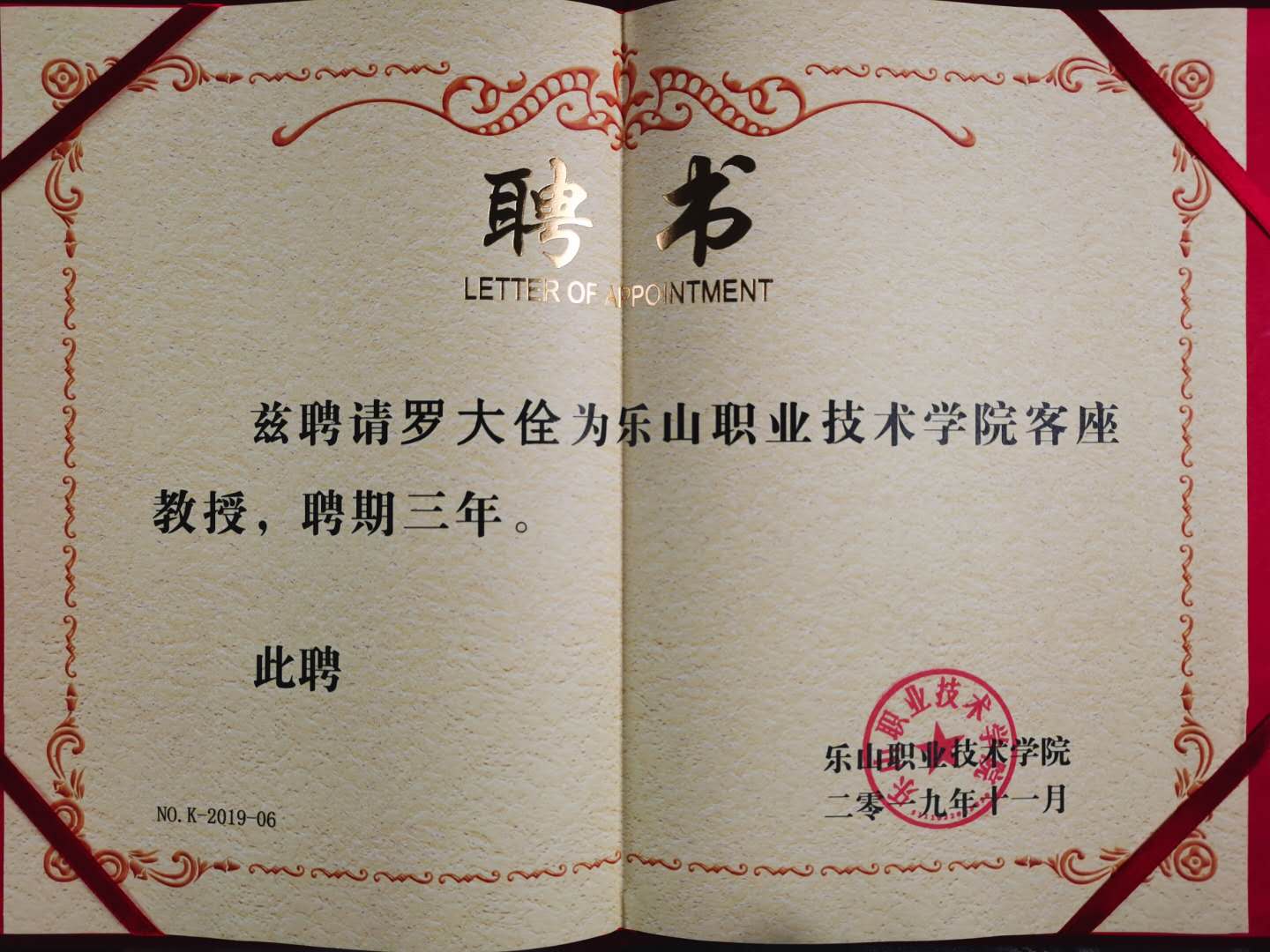 10月28日,乐山职业技术学院在图书馆学术报告厅举行客座教授聘任仪式,雅职院图书馆馆长罗大佺被聘为客座教授,乐山职业技术学院院长刘忠亲自为罗大佺颁发了聘任证书。