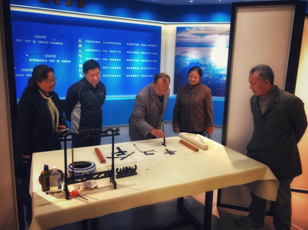 活动中,陆小路、蔡晓龙带领退休教师们参观了经开区实训与服务中心校史馆,在参观过程中,退休教师们看到一张张过去的照片,不禁回忆起在职时的任教时光,满怀温情地讲述他们记忆中学院的发展变迁,退休教师杨明还即兴挥毫书写了“今又重阳”。随后退休教师们还参观了学院智能制造与信息工程学院、中医与康复养生学院实训室,感慨学院日新月异的变化发展。