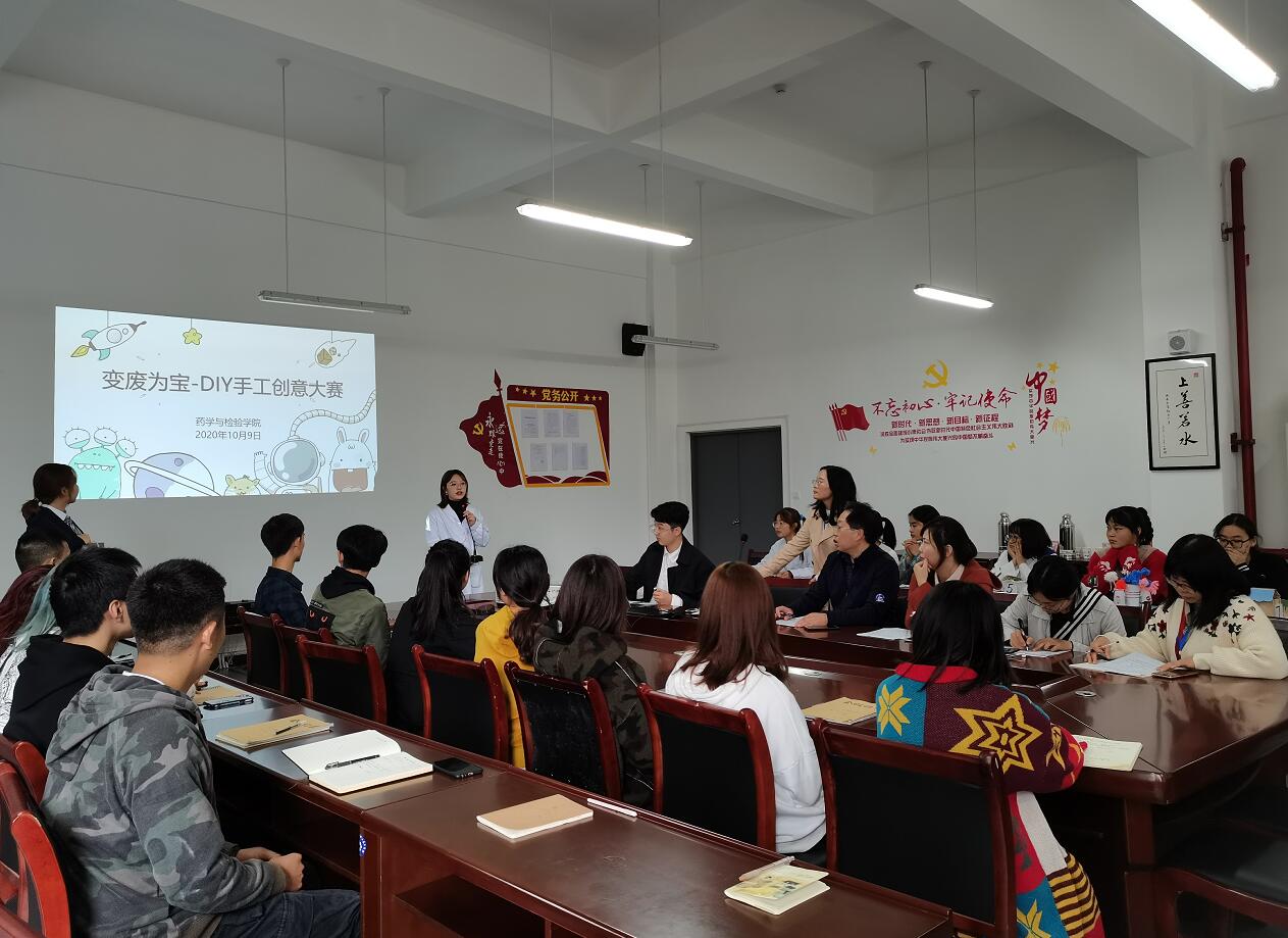 为了树立同学们废物利用,环保创新的意识,让同学们在接触事物的过程中关心身边的事物,学会思考如何与环境保持和谐统一发展。药检学院于10月9日13:30在会议室205进行了“变废为宝”手工DIY大赛的评分活动,杨泽刚、陈静、龙凯琴、王宁、马春兰老师担任评委,到场参赛选手、评委及观众共计40余人。