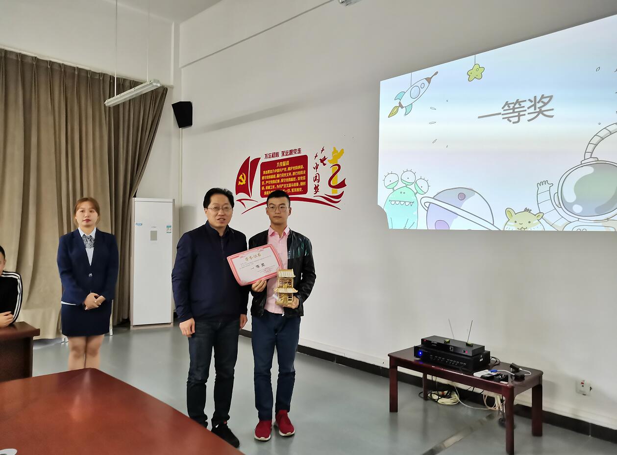 DIY大赛经过了选手们的精心准备,共有九组作品来到了今天的比赛。活动开始,由九位参赛选手依次上台展示并讲解自己的作品,在场的评委老师根据选手们的作品以及讲解表现酌情给出评分。在工作人员进行统分的这段间隙,大家一起观看了参赛选手们制作作品时的精彩瞬间,让大家更加了解变废为宝的过程,这也是参赛选手为自己作品拉分的加分项。去掉一个最高分与最低分,取其平均分。比赛评出了优秀奖和一二三等奖,李涛同学最终获得了一等奖。比赛在一阵阵掌声中接近了尾声,在杨泽刚对本次活动进行完总结后,活动以参赛选手与评委老师进行大合照的形式划上了句号。
