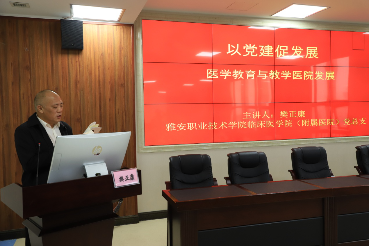 通过讲授党课,樊正康结合当前形式,对全院工作提出三点要求:一是要统一思想、提高认识。医教一体、协同发展是医学教育必由之路,要牢固树立医教一体融合发展的理念,发挥教学医院的优势,做到医疗服务和教育教学两手抓。二是要明确定位,找准方向。明确临床医学院(附属医院)是培养基层健康守门人的角色定位,认清教学医院有医疗服务和教育教学双重职能,要以医改引领教改,规范化临床医学人才培养体系,运用信息化技术,加快“互联网+医疗健康”发展,建立“医学+X”多学科交叉融合平台和机制。三是要解读政策,制定规划。深入学习国务院办公厅印发《关于加快医学教育创新发展的指导意见》 《“健康中国2030”规划纲要》及习近平2020年9月22日在教育文化卫生体育领域专家代表座谈会上的讲话精神,用理论武装头脑,将健康中国与教育强国相结合,要从最突出问题着眼,编制好临床医学院(附属医院)“十四五”规划,助力临床医学院(附属医院)医教研管等方面快速发展。