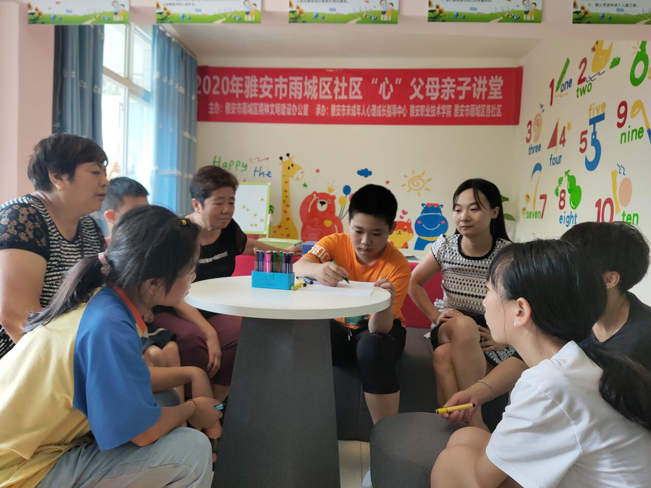 为进一步加强未成年人思想道德建设,架起孩子与家长沟通的桥梁,提升家庭心理健康服务水平,7月14日-7月23日,由雅安市雨城区精神文明建设办公室主办,雅安市未成年人心理成长指导中心、beat365在线唯一官网承办的第一期“心”父母亲子讲堂在社区心理辅导点顺利举行。