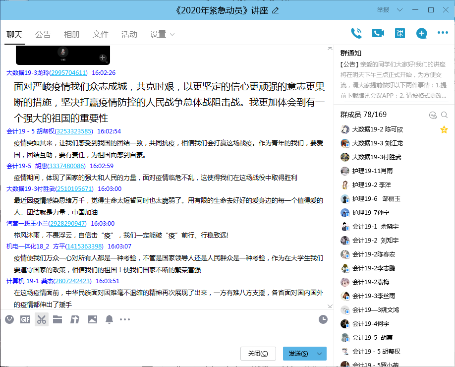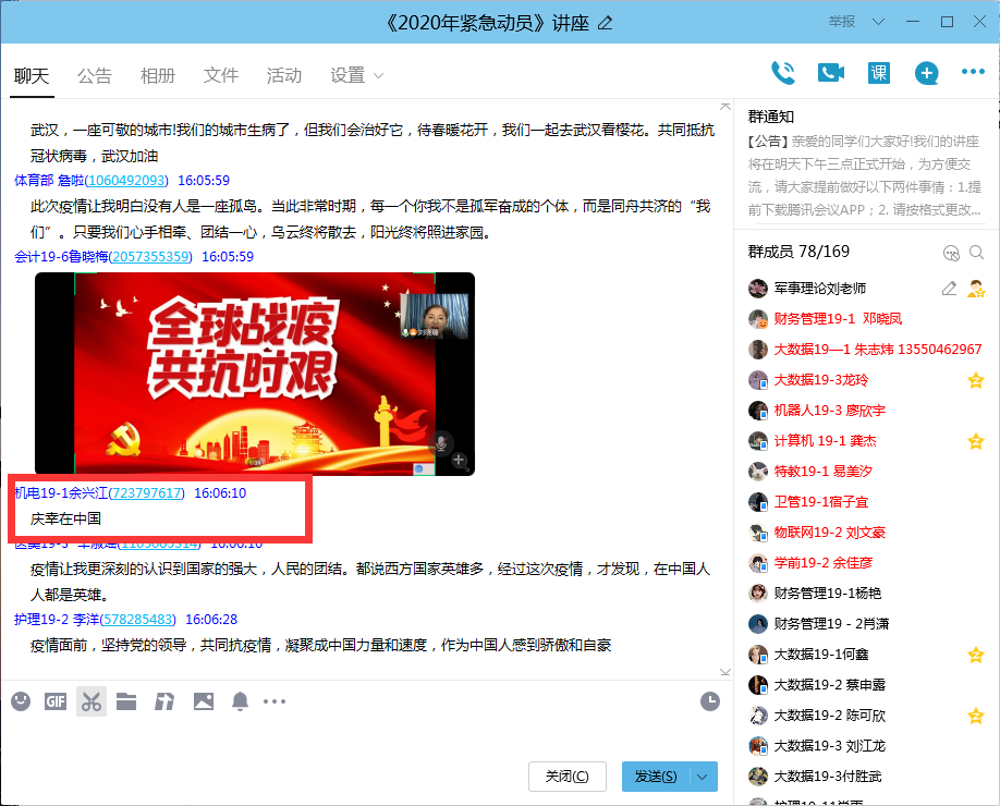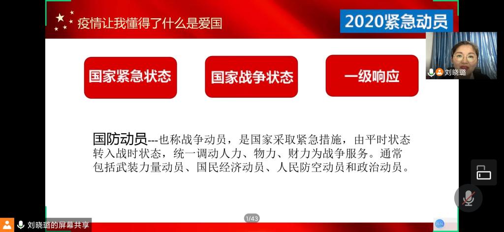 7月7日下午,学生处教师刘晓璐通过“腾讯会议”、“学习通”平台在线为2019级 160名学生代表,作了题为“2020紧急动员”的国防教育主题讲座。本次讲座通过对新冠肺炎疫情期间我国进行全国范围的国家动员以及紧急措施的深刻阐述,展示了全国人民的高度组织纪律性和爱国热情,彰显了国家超强的动员能力和潜在实力。