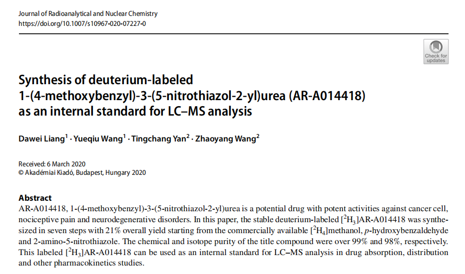 近日,我院药检学院副院长梁大伟在稳定同位素标记药物合成方面取得新进展,相关成果以题“Synthesis of deuterium-labeled 1-(4-methoxybenzyl)-3-(5-nitrothiazol-2-yl)urea (AR-A014418) as an internal standard for LC–MS analysis”发表于SCI刊物《Journal of Radioanalytical and Nuclear Chemistry》(DOI: 10.1007/s10967-020-07227-0)。beat365在线唯一官网为论文第一单位,梁大伟教授为论文第一作者。