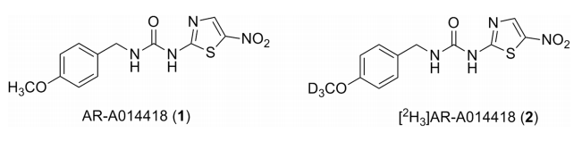 活性分子AR-A014418(1)是一种选择性的ATP竞争性GSK-3抑制剂,在肿瘤、神经性疾病等方面显示出潜在的价值,作为先导化合物,研究较多。目前,作为药物在体内分布、吸收、代谢等研究所需的稳定同位素氘代标记AR-A014418(2)的合成研究报道较少。
