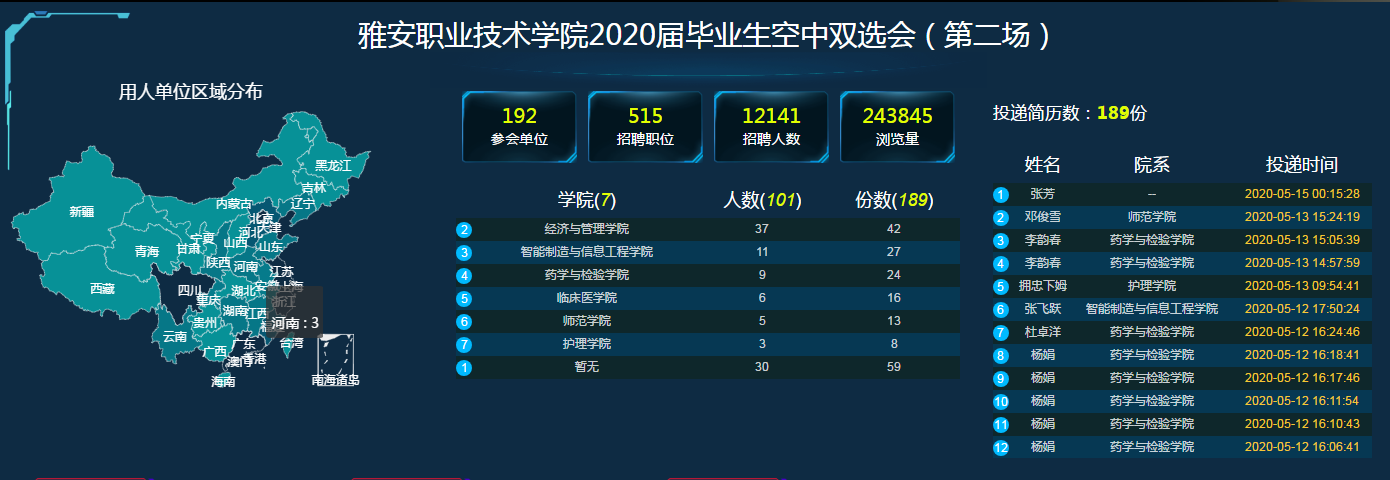 本次空中双选会采用PC端——就业宝网站和手机端——完美校园支付宝小程序两种参与方式同时进行。参加本次双选会的用人单位共有192家,共发布职位数量515个,招聘人数12141人,参与学生人数101人,学生在线投递简历189份。