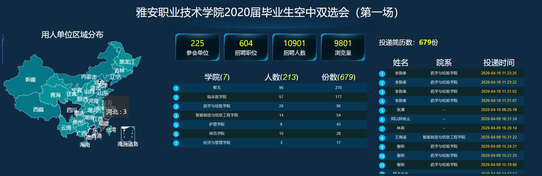 为持续推进学院毕业生就业工作,贯彻落实川人社办《关于做好疫情防控期间有关就业工作的通知》文件要求,4月7-9日,学院招生就业处携手各二级学院,启用“完美校园”就业宝平台举办了2020届毕业生空中双选会(第一场)。