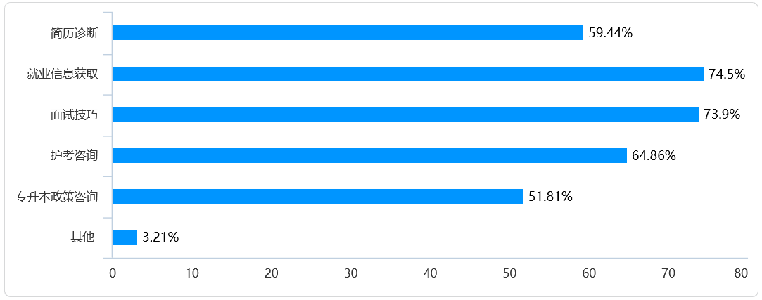 毕业生在问卷中反馈的具体问题主要包括:简历编写、就业信息获取、面试技巧、护考咨询及专升本政策咨询等。
