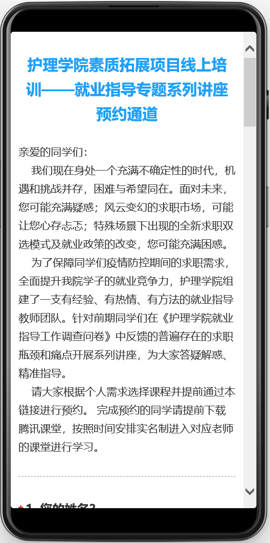 经过近十天的精心准备,对毕业生需求、最新就业政策及疫情防控期间求职双选模式进行全面整合后,护理学院线上就业指导系列讲座正式上线,并于3月26日开通网上预约通道。