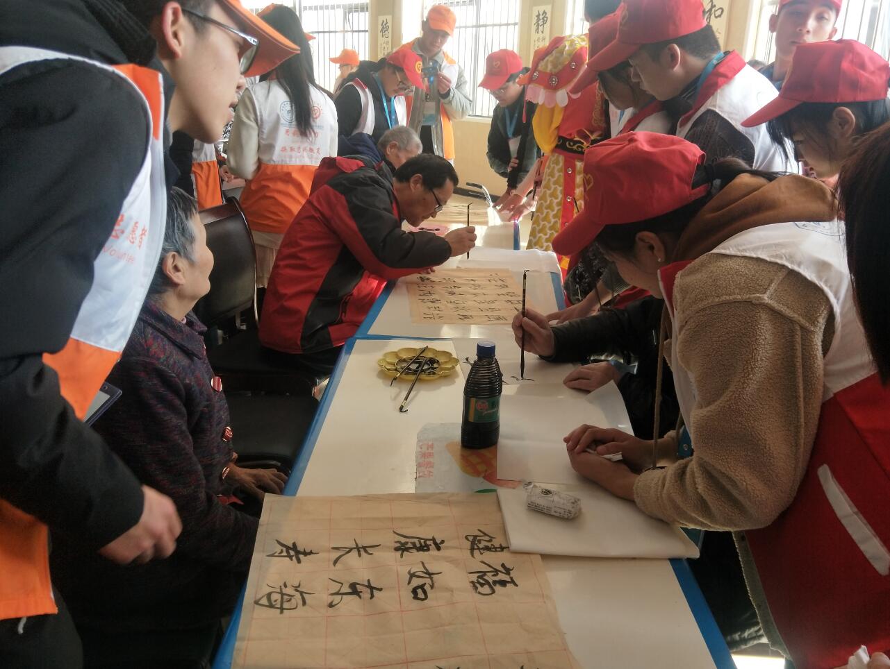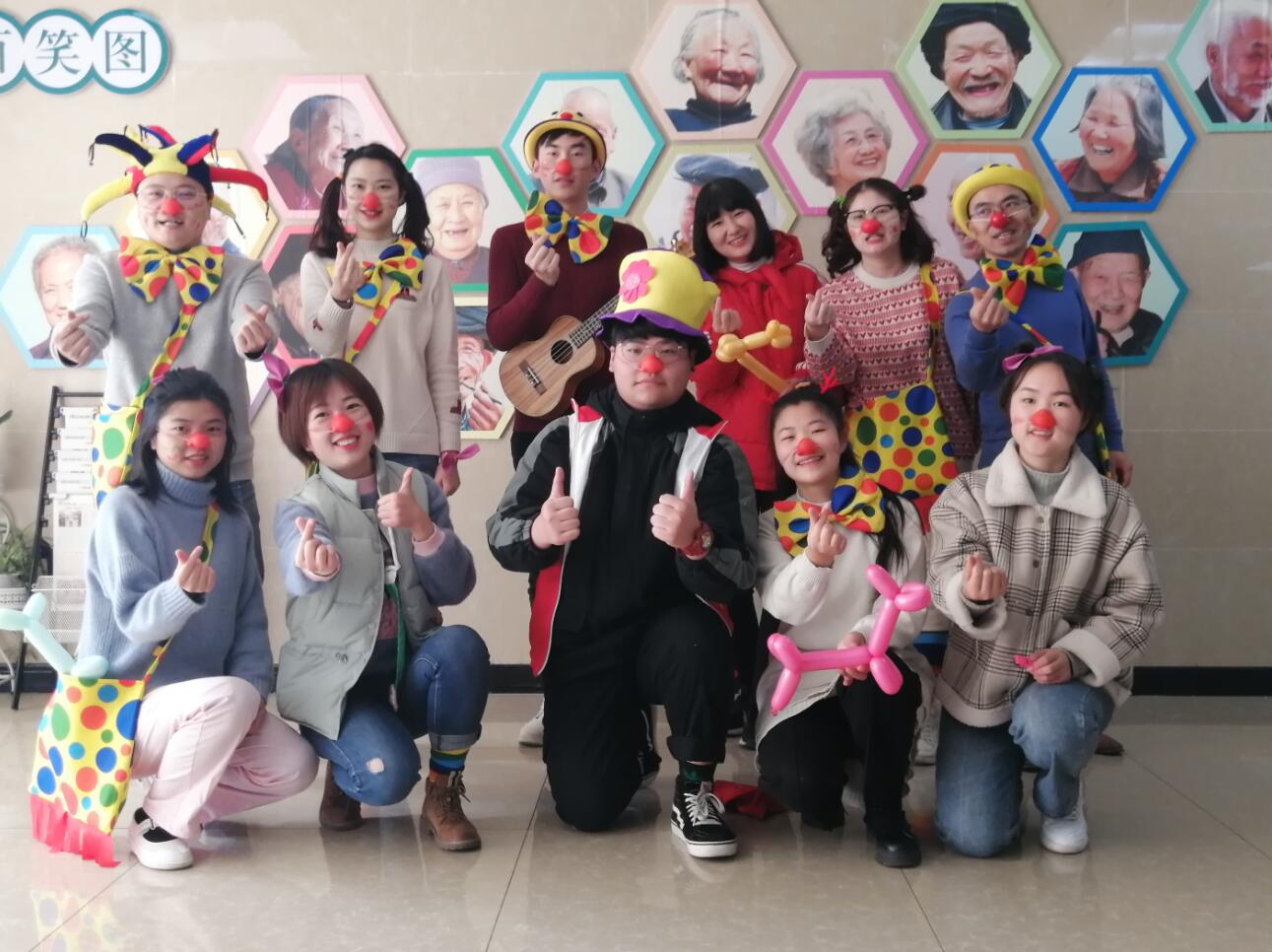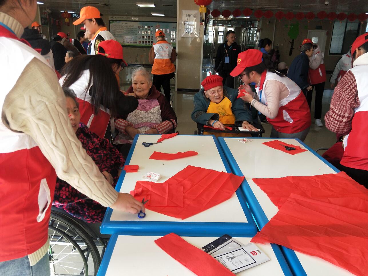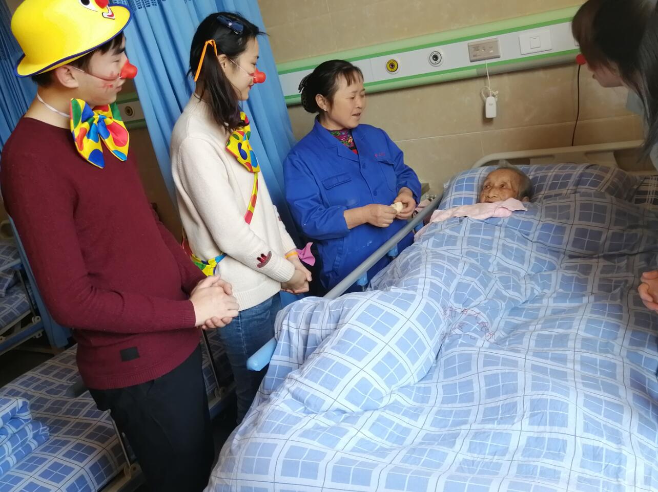 文艺表演结束后,一部分志愿者带领老人们一起编中国结、剪窗花、写书法。一部分志愿者和内二科医生一起扮演可爱小丑穿梭在各个病房,给老人们送去欢乐,整个疗养中心暖意满满,笑声不断。