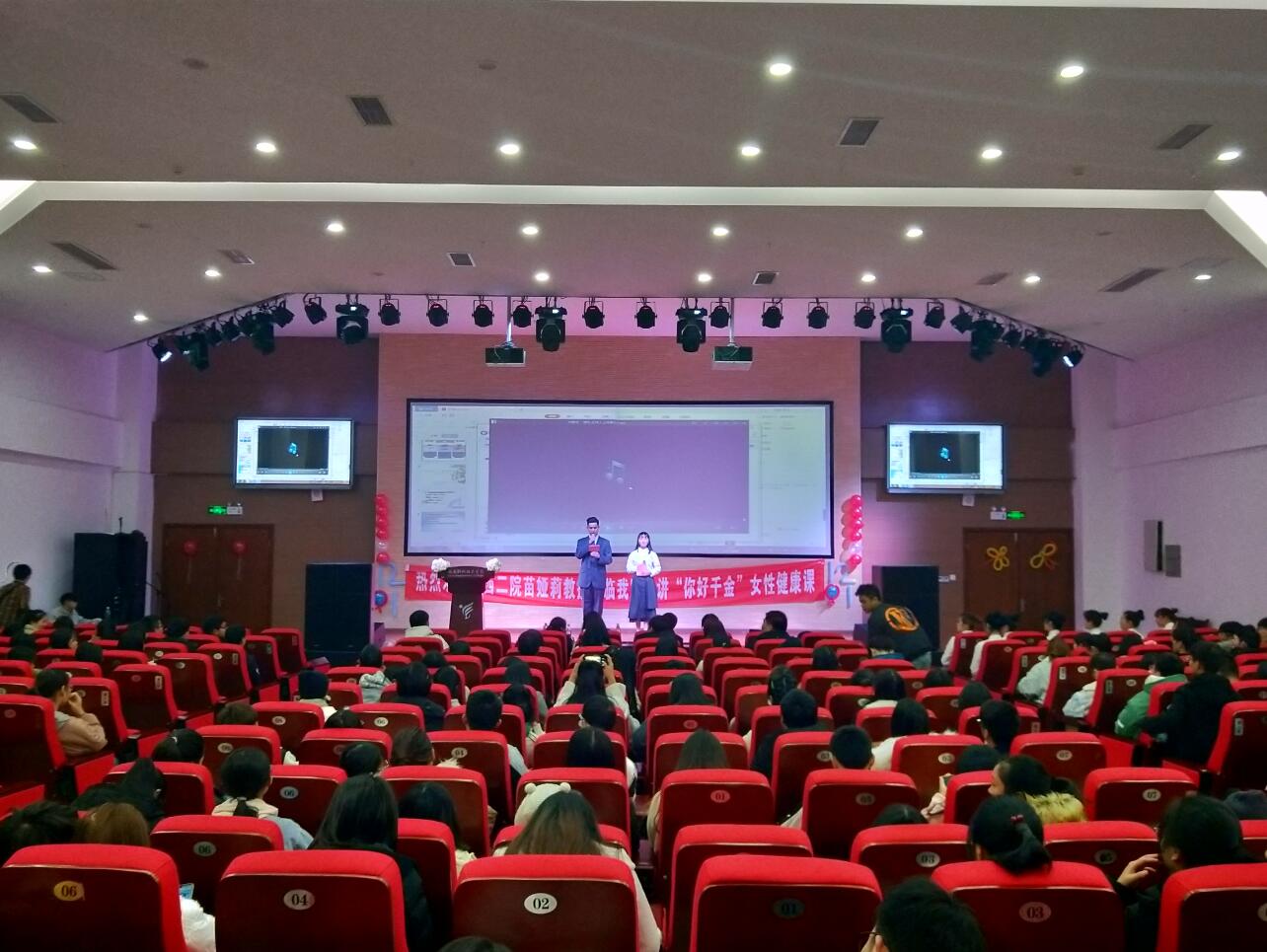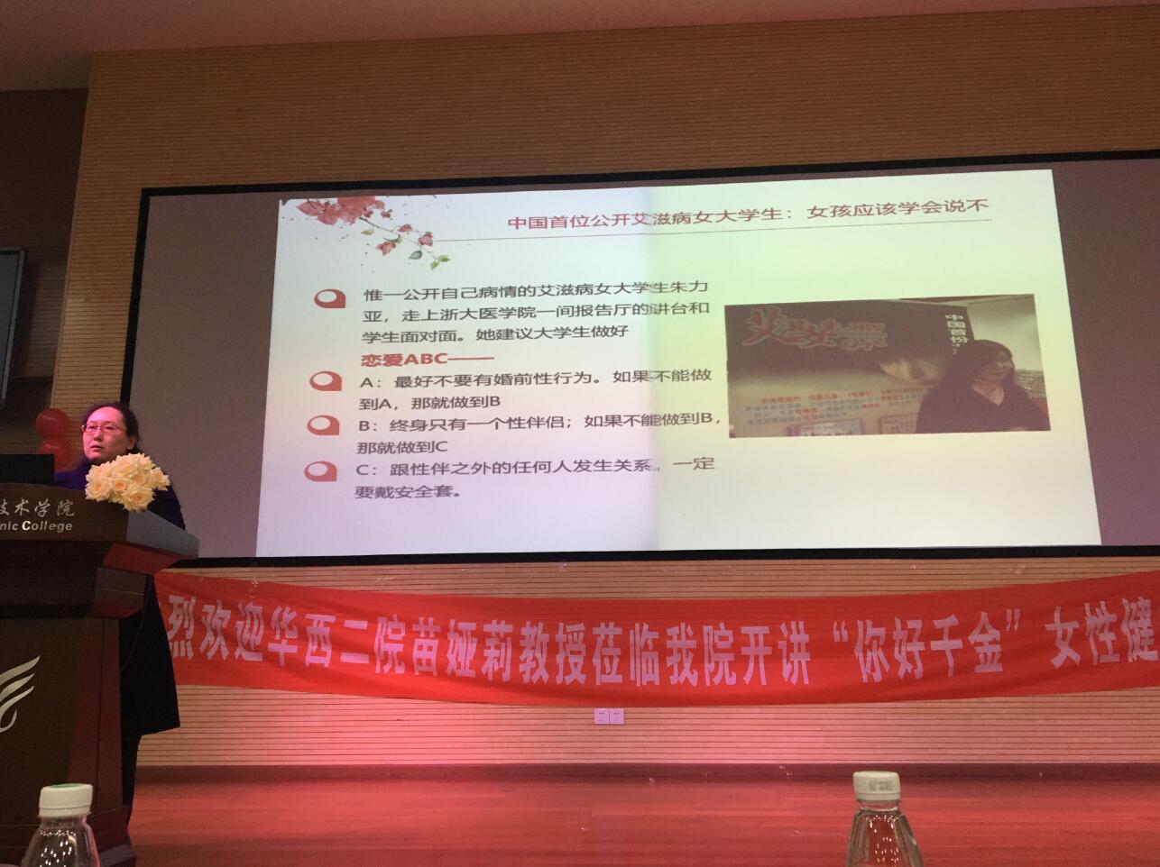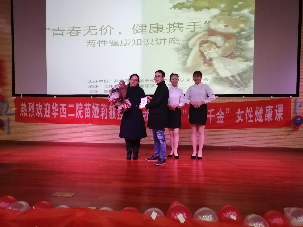苗娅莉教授以四川地区艾滋病相关数据告诫同学们艾滋病的危害性和严重性,着重从月经、妇科炎症、宫外孕产生的原因以及危害、艾滋病传播途径和危害四个方面介绍了女生的健康知识以及如何预防艾滋病疾病。苗教授语言幽默风趣、理论讲授深入浅出,结合大学女生的临床案例又有很强的现实感,会场不时传来阵阵笑声。在解疑答难互动环节,各位同学踊跃发言,积极提问,苗教授作出了耐心专业的解答。讲座结束后,阳建武老师为我院授予 “女生健康中国行”公益活动教育基地的称号。活动最后,张晓惜老师总结讲话,告诫同学们要自尊自爱,洁身自好,增强自我保护意识,爱自己爱他人。