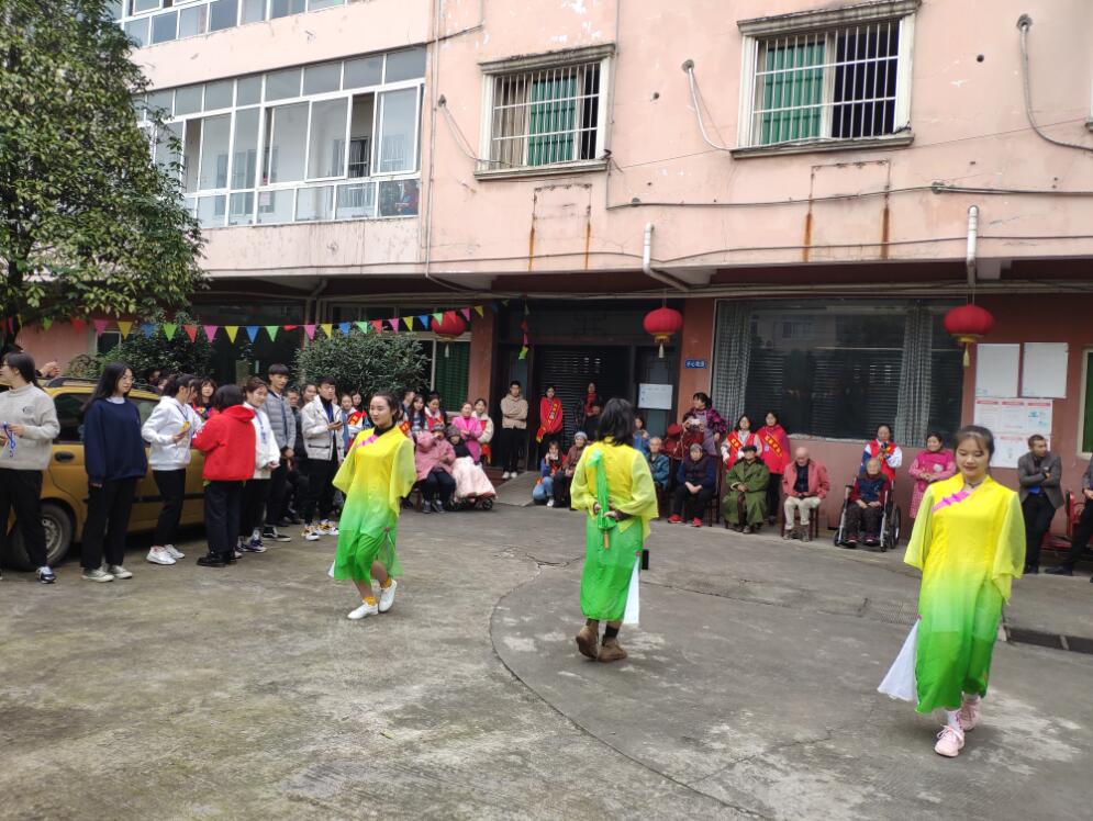 在顺安驾校的赞助下,经开区校区和青年路校区的志愿者都顺利安全到达目的地。到达敬老院后,志愿者按计划分为三个小组,在组长的分工带领下有序地进入各楼层的各个房间拜访老人。志愿者们积极主动地帮助老人打扫房间、整理衣物,和他们拉家常、问健康,为老人们做简单的按摩,陪着老人散步。一时间,沉寂的敬老院气氛慢慢的活跃了起来,每位老人脸上都充满幸福快乐的笑容。临近十点,志愿者们邀请爷爷奶奶到院子里欣赏志愿者精心准备的《映山红》《歌唱祖国》《忆.水墨》等节目。歌声舞影中,老人们更是喜笑颜开,有一位奶奶看着表演不禁回忆起了年轻时候的歌舞爱好,顺着活动的热闹气氛为大家唱起了民歌,志愿者们也一起助唱。表演结束,志愿者们开始为老人们准备午餐,大家踊跃地加入到了包抄手的活动中,不一会儿就圆满完成了任务。最后,志愿者们清理好厨房、院子卫生,和老人们合影留念。