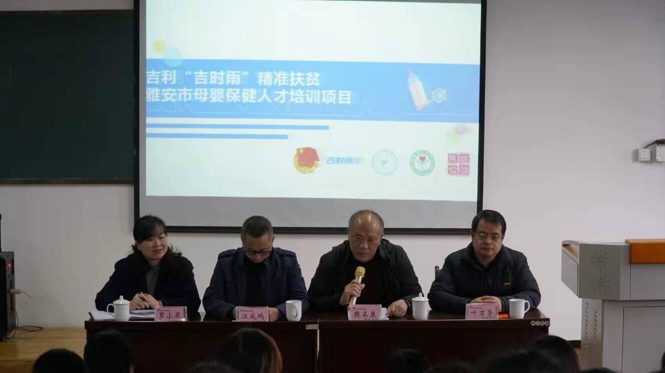 为助力脱贫攻坚,推进就业扶贫,11月19日上午,学院承办的“吉利.吉时雨”雅安市母婴保健师技能培训项目开班仪式在我院青年路校区举行。学院副院长、临床医学院党总支书记樊正康,吉利控股集团企业社会责任部高级经理叶万芳,共青团雅安市委副书记江成鹏,雅安市人民医院党委委员、妇幼保健中心主任罗小燕等参加开班仪式。本期培训项目共计服务雅安市范围内的25名学员,帮助25个家庭增收。