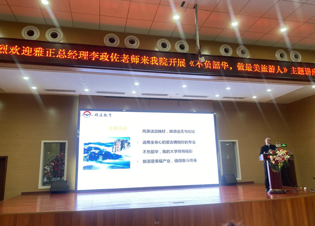 11月5日,经济与管理学院邀请了四川省雅正国际旅行社有限公司董事长、成都旅游导游协会副会长李政佐来校为我院旅游管理专业、酒店管理专业的全体学生开展了主题为“不负韶华,做最美旅游人”的讲座。经管学院党支部副书记任敏、旅游管理教研室主任锋琳和全体教师参加了本次讲座。