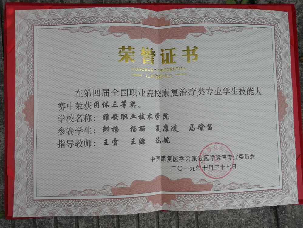 在历经48小时的紧张角逐后,邹杨同学获得康复问诊个人二等奖,夏康凌同学获得理论竞赛个人三等奖,杨丽同学获得个人精神风貌奖,并摘得团体三等奖的好成绩。王雪、王源、陈航三位老师获得优秀指导教师奖。